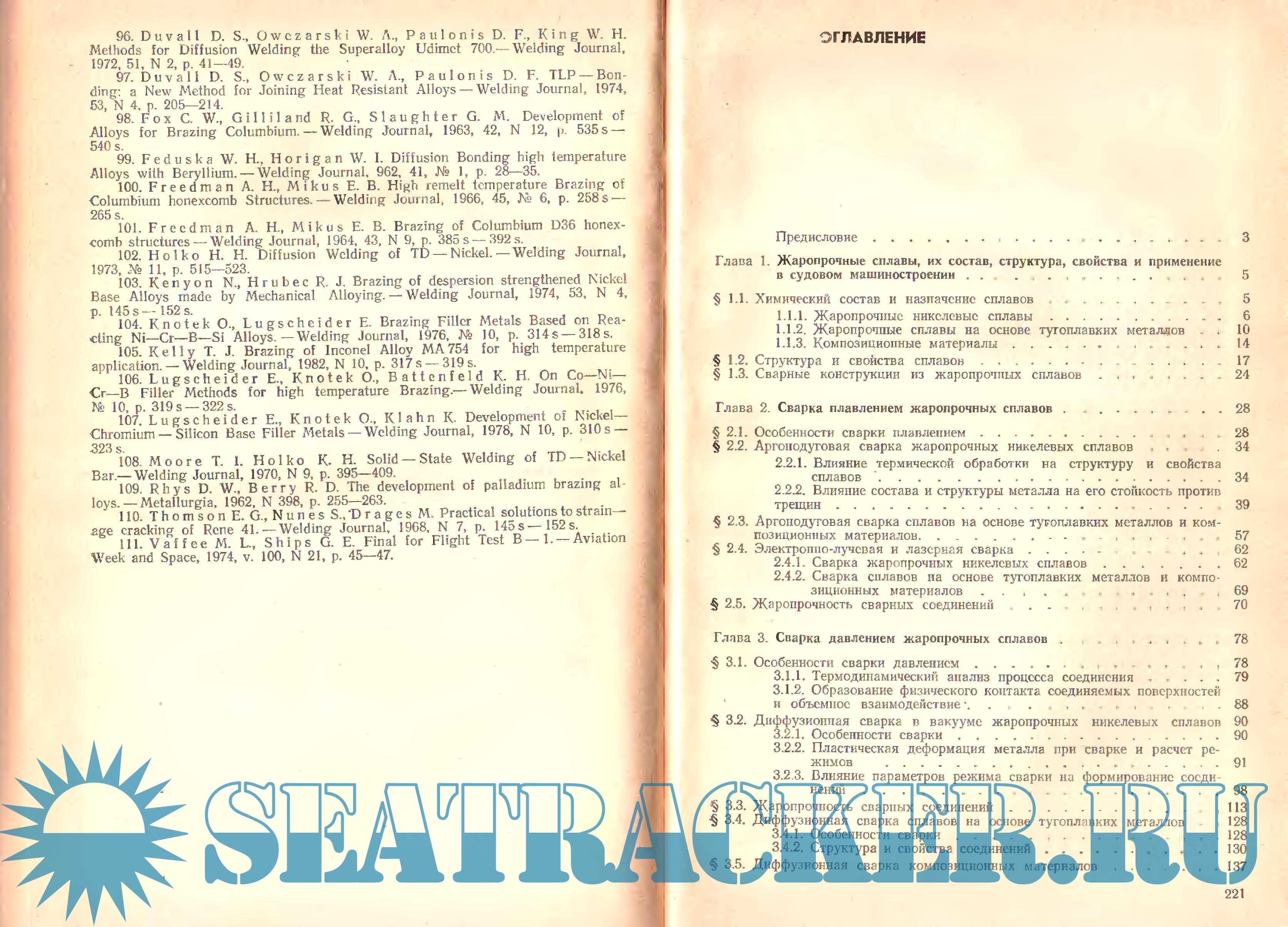 В книге использованы работы автора, занимающегося сваркой и пайкой жаропрочных сплавов в судостроении более 20 лет, а также наиболее интересные материалы, опубликованные советскими и зарубежными исследователями в последние годы. При этом автор старался избегать подробного описания вопросов, изложенных в фундаментальных монографиях Б. И. Медовара, В. Н. Земзина и в работе под редакцией М. X. Шоршорова. В книге отсутствует детальное описание процессов сварки отдельных марок сплавов. Наибольшее внимание уделено общим закономерностям и особенностям процессов их соединений. Подробно рассмотрено влияние термического цикла на структуру и свойства сварных соединений, даны основные положения по расчету режимов сварки давлением, раскрыты как общие, так и специфические вопросы пайки жаропрочных сплавов.