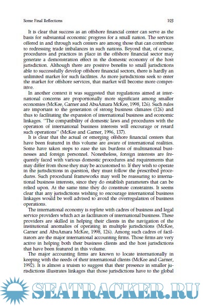 Year: 2000 Language: english Author: David L. McLee, Don E Garner & Yosra AbuAmara McKee Publisher: Quorum Books ISBN: 1–56720–310–8 Format: PDF Quality: eBook Pages count: 223 Description: The volume is divided into four parts. Part I beyond the current overview provides the general background or foundation for the specifics to follow. In it the positive functions of offshore financial centers are reviewed with special emphasis upon their hosting of international services. Care is taken to point out what attributes are needed by jurisdictions hoping to succeed as offshore financial centers. Examples of the involvement of the major accounting firms in such centers are also included.
