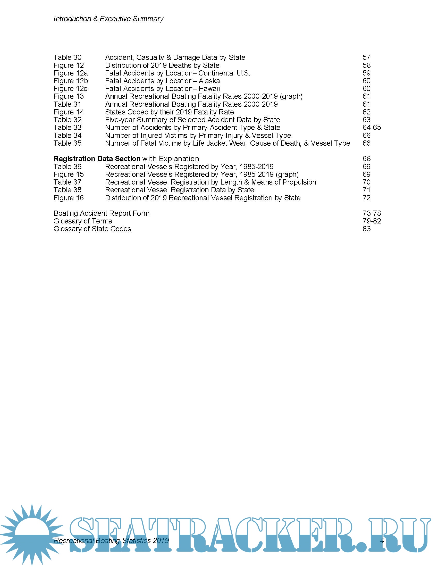 Description: Recreational Boating Statistics 2019, the 61st annual report, contains statistics on recreational boating accidents and state vessel registration. This publication is a result of the coordinated effort of the Coast Guard and those states and territories that have Federally-approved boat numbering and casualty reporting systems. These include all states, the District of Columbia, Puerto Rico, Guam, the Virgin Islands, American Samoa, and the Commonwealth of the Northern Mariana Islands.