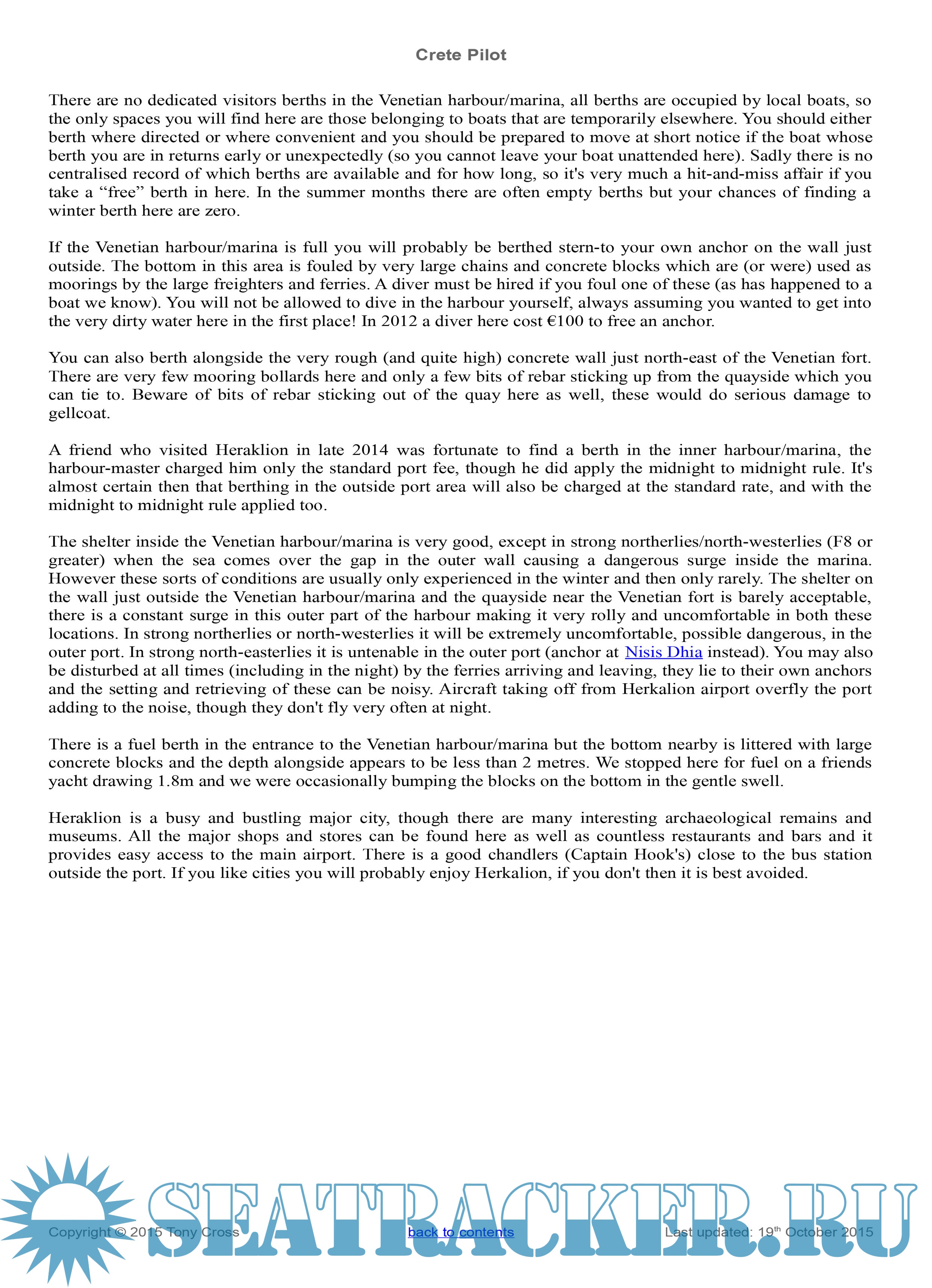 Description: This yachtsman's pilot for the Greek island of Crete was begun originally as a set of cruising notes following our trip around Crete in October and November 2007 in our 45ft sailing yacht “Little Roundtop”. Since that date the cruising notes have been gradually updated and added to as more ports and anchorages were visited, either by ourselves or by trusted close friends, and in 2010 it was felt that they were complete enough to be useful as a yachting pilot for Crete. The information in here is regularly updated, either through our own visits or by those of trusted friends, and the information in here is as up-to-date and as complete as we can make it.