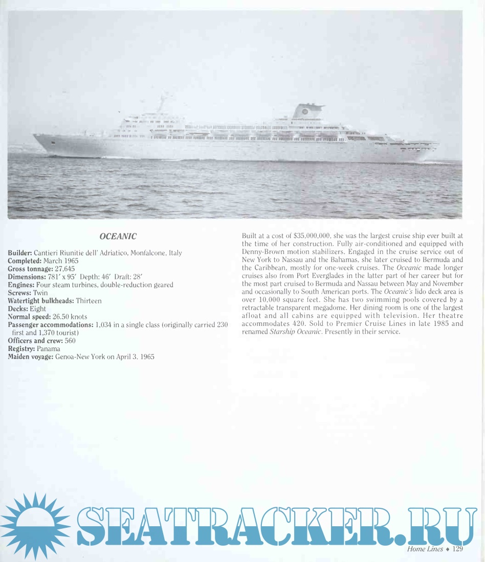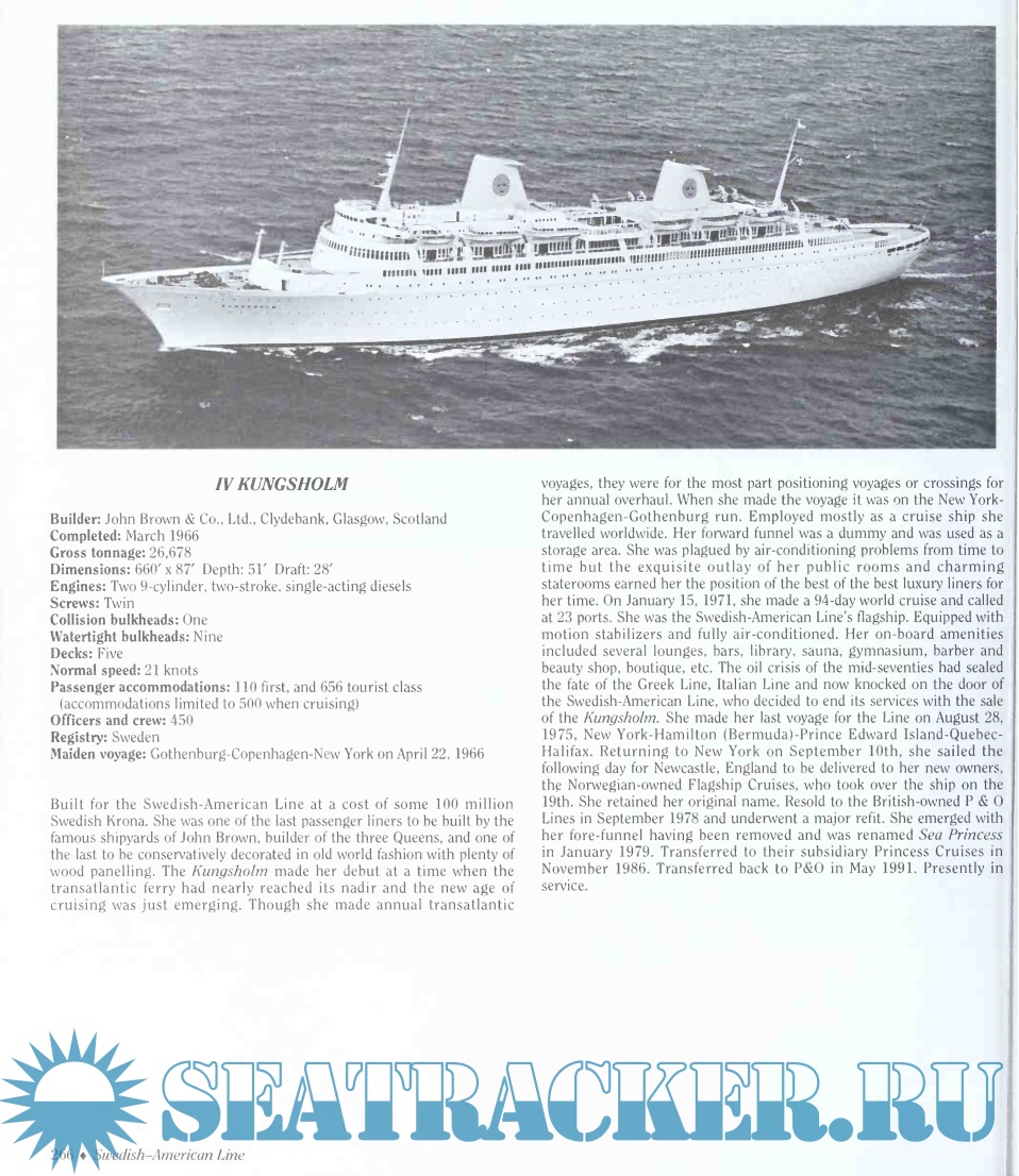 Description: An update of the author's earlier book "Passenger Liners of the World Since 1893," this volume appears to include all of the information from that book, plus 60 additional pages of info about more recent ships. Descriptions of each ship include the name of builder, date of completion, dimensions, weight, engine type, decks & passenger accommodations, speeds, maiden voyage, bulkheads and screws, along with a black & white photo.