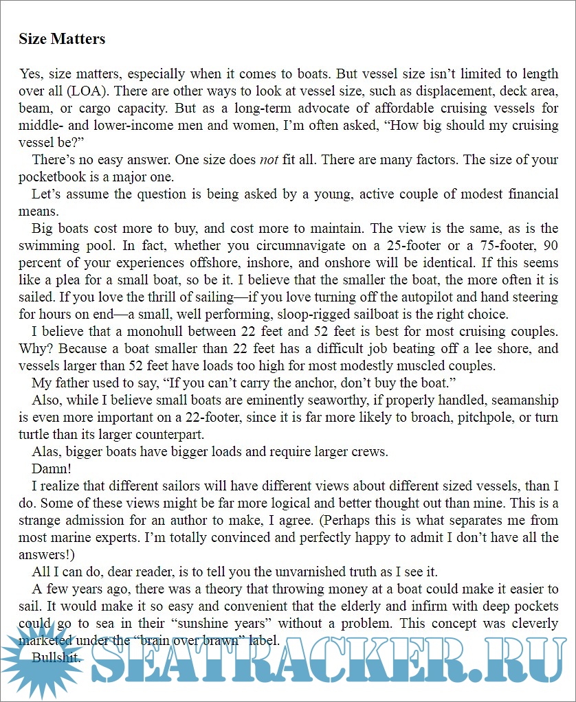 Year: 2016 Language: english Author: Gary M. Goodlander Genre: Manual Publisher: Self Published ISBN: 1533352720 Format: Other Quality: eBook Pages count: 338 Description: As author remarks "Storms exist. Pretending they don’t or that they will never hit you is both stupid and childish". The purpose of this book is not to encourage ayone to sail into storms, but rather to assist reasonably experienced sailors to survive storms with minimal damage to vessel and crew. Since not all storms can be avoided, the sailor must be properly prepared, instead of fear them. There’s only one way to obtain this offshore calm and self-confidence. It is called seamanship, or common sense based upon experience. It cannot be purchased. Seamanship must be earned over time, and the more seamanship one has, the less fear suffers. A little fear can be useful, but too much can paralyze. The base idea of the book is that a good boat is obviously better than a bad one, but there is no direct relationship between cost and safety. A small, storm-proofed boat can be safer than a large, expensive yacht. In this book the author widely dispenses tips, tricks and rules to make safer the existing boat. Advices covers everything the offshore sailor needs to know about vessel preparation, reducing sail, reefing, towing slowing drogues, deploying a parachute-type sea anchor, from where to step into a life raft, why deploy fenders, what things one must avoid, and ultimately, hanging to a Jordan Series Drogue. Additional info: Folder contains both AZW3 and epub version of the book