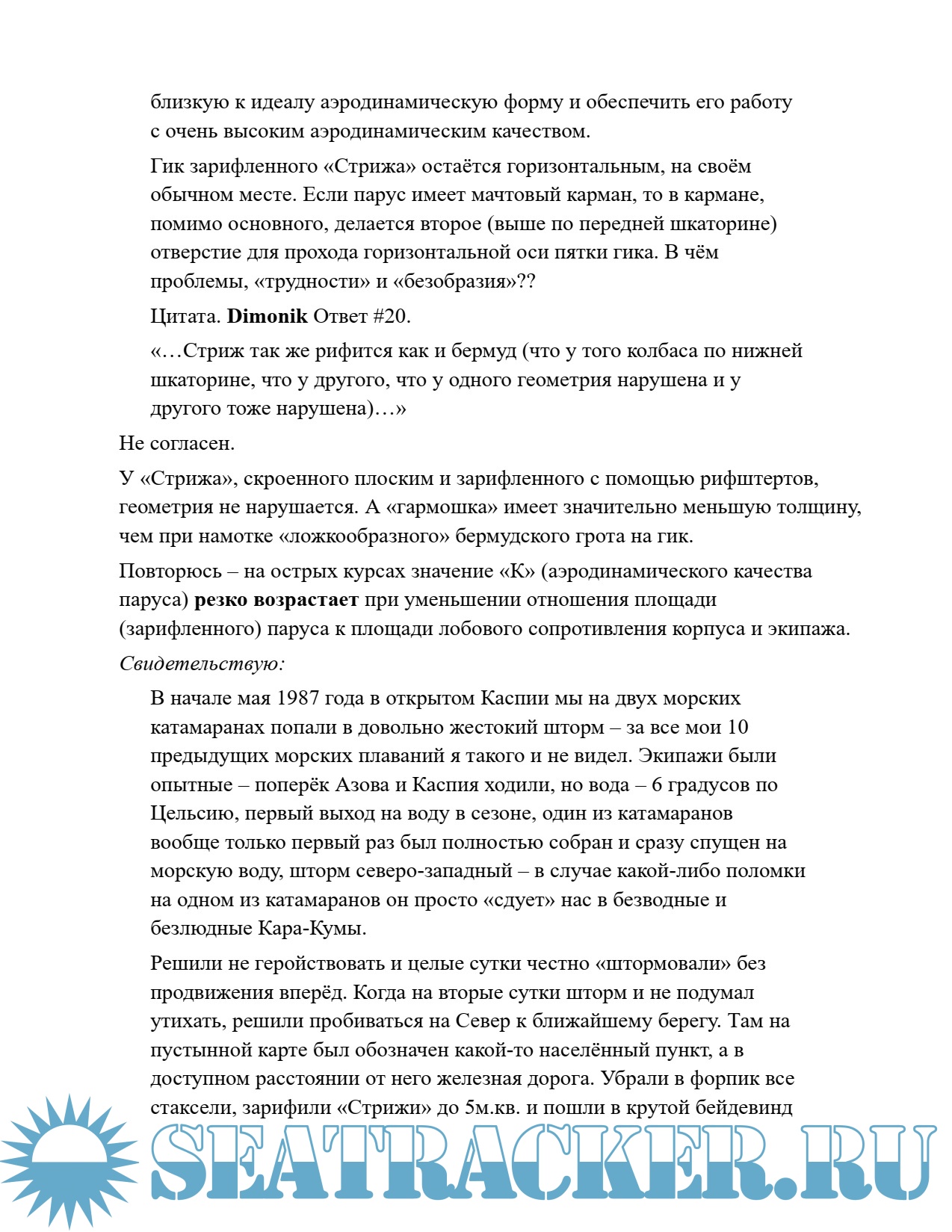 Год выпуска: ? Язык: русский Автор: Перегудов. В. Жанр: Руководство Издательство: ? Формат: PDF/DOCX Качество: Изначально компьютерное (eBook) Количество страниц: 15 Описание: На форуме опять обсуждается парус «Стриж» и опять без понимания этого вопроса. Цитата. Piton45. Ответ #21. «1) Стриж по Перегудову должен иметь в вертикальной плоскости форму "часть поверхности цилиндра". Для поддержания такой формы ему нужна жесткая (не гнущаяся) мачта. При такой форме паруса возникает "жопа" на верхнем и нижнем краях паруса из-за перетекания воздуха из области с большим давлением в область более низкого давления.» На самом деле всё обстоит с точностью «до наоборот». Одной из причин появления «Стрижей» было желание избавиться именно от этой «ж…», так характерной для парусов старых типов, в том числе и «бермудских гротов».