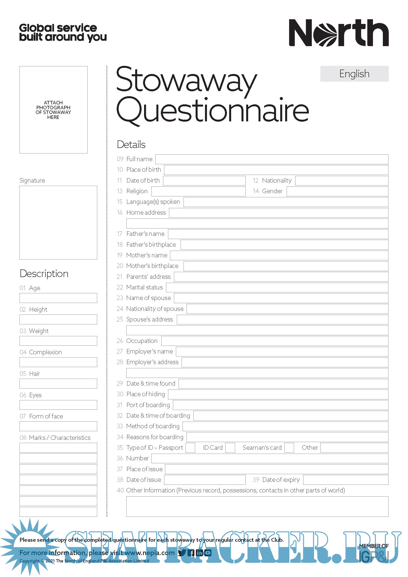 Year: 2021 Language: english Author: Human Rights at Sea Format: PDF Quality: eBook Pages count: 19 Description: Stowaways have been an expected, though unwanted feature of the maritime environment including within the shipping and fisheries industries since ships have travelled between countries and regions. The presence of stowaways on board commercial vessels, in particular, causes a plethora of legal, economic, and indeed political issues, the consequences of which come at cost in monetary and reputational terms to an array of interrelated industry stakeholders. These include owners, managers, insurers and the crew themselves. Yet, underlying these impacts lie human accounts behind the stowaways, each with its own set of unique human factors combining to impel the would-be stowaway to embark on such a perilous journey. This Insight Briefing Note aims to look at the broader issue of stowaways on commercial ships with a particular focus on the ‘push’ and ‘pull’ factors influencing the individuals’ decisions to resort to potential criminal means to achieve their ends. Included questionnaire has been prepared by North P&I to assist in establishing, principally, the true nationality of a stowaway who is without valid travel documentation and to facilitate issuance of a temporary travel document from his country of origin in order that the stowaway can be disembarked and repatriated. Every effort, therefore, should be made to obtain a truthful answer to each of the questions.