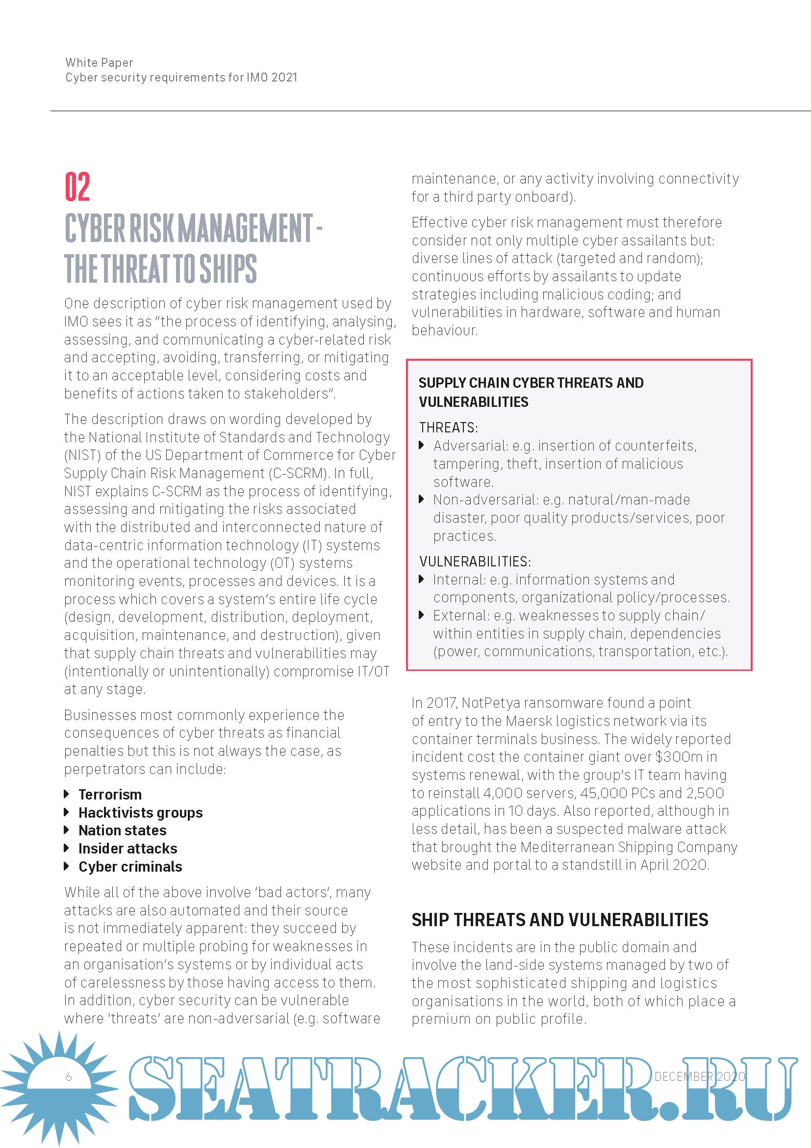 Year: 2021 Language: english Author: INMARSAT Format: PDF Quality: eBook Pages count: 40 Description: Developments in connectivity and the transfer of data in greater volumes between ship and shore continue to bring significant gains for passenger experience, operations, fleet management efficiency and crew welfare, but they also increase the vulnerability of critical systems onboard vessels to cyber attacks. The following report offers ship owners and managers guidance covering their responsibilities under the new IMO regime.