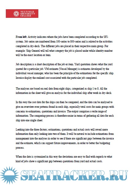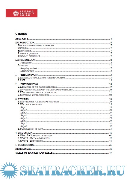 ABSTRACT ........................................................................................................................................... 4 INTRODUCTION ................................................................................................................................. 5 DESCRIPTION OF RESEARCH PROBLEM ............................................................................................... 7 THEORIES: ........................................................................................................................................... 7 HYPOTHESIS:....................................................................................................................................... 7 RESEARCH QUESTION: ........................................................................................................................ 7 RESEARCH QUESTION 2:...................................................................................................................... 7 METHODOLOGY: .............................................................................................................................. 8 Population: ................................................................................................................................... 12 SAMPLING: ........................................................................................................................................ 12 Sampling method: ......................................................................................................................... 12 Sampling size: .............................................................................................................................. 12 1. THEORY PART ......................................................................................................................... 13 1.1 RULES AND REGULATIONS FOR DRY-DOCKING ........................................................................... 13 1.2 SFI............................................................................................................................................... 15 2. DRY-DOCKING ........................................................................................................................ 18 2.1 ANALYSIS OF THE DOCKING PROCESS ......................................................................................... 19 2.2 FIVE ESSENTIAL STEPS IN THE DRY-DOCKING PROCESS .............................................................. 20 2.3 THE PREPARATION FOR DRY DOCKING........................................................................................ 21 2.4 INTERNAL SHIP PROCEDURES ...................................................................................................... 22 3. RESULTS ........................................................................................................................................ 23 3.1 KEY FIGURES FOR THE ANALYSED SHIPS .................................................................................... 24 3.2 DATA FOR EACH SHIP .................................................................................................................. 25 Ship 1 ............................................................................................................................................ 25 Ship 2 ............................................................................................................................................ 26 Ship 3 ............................................................................................................................................ 27 Ship 4 ............................................................................................................................................ 28 Ship 5 ............................................................................................................................................ 29 Ship 6 ............................................................................................................................................ 30 Ship 7 ............................................................................................................................................ 31 Ship 8 ............................................................................................................................................ 32 3.3 COMPARISON OF DATA ................................................................................................................ 33 4. DISCUSSION .................................................................................................................................. 41 4.1 PART 1 – SUMMARY OF RESULTS ................................................................................................ 41 4.2 PART 2 – DATA AND RESULTS ..................................................................................................... 42 4.3 PART 3 - LIMITATIONS ................................................................................................................ 44 5. CONCLUSION ............................................................................................................................... 45 REFERENCES .................................................................................................................................... 46 TABLE OF FIGURES AND TABLES ............................................................................................. 47
