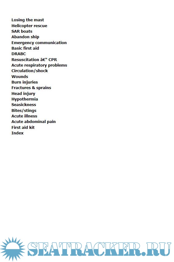 - First aid: CPR, breathing problems, drowning, shock, trauma, treating wounds, burns, hypothermia, seasickness