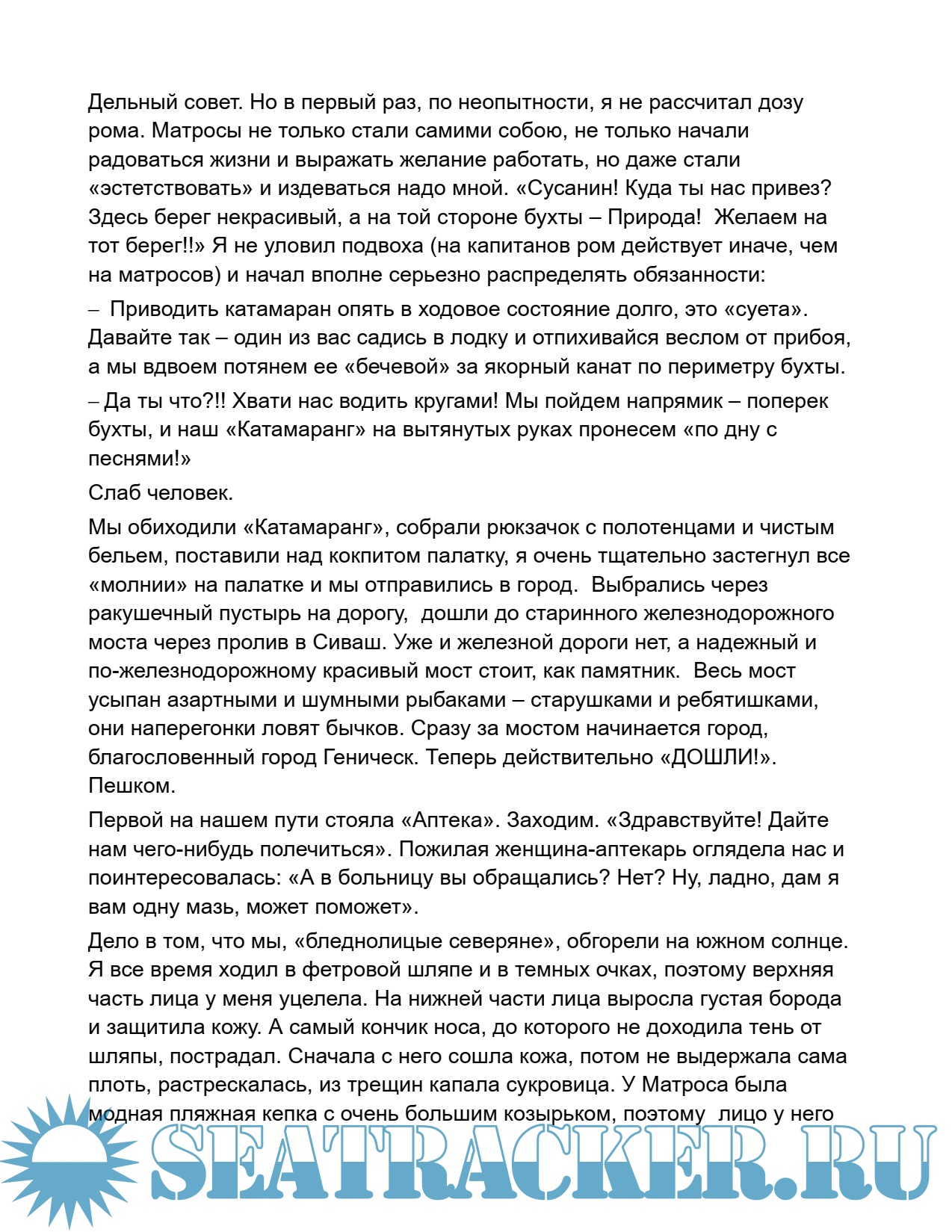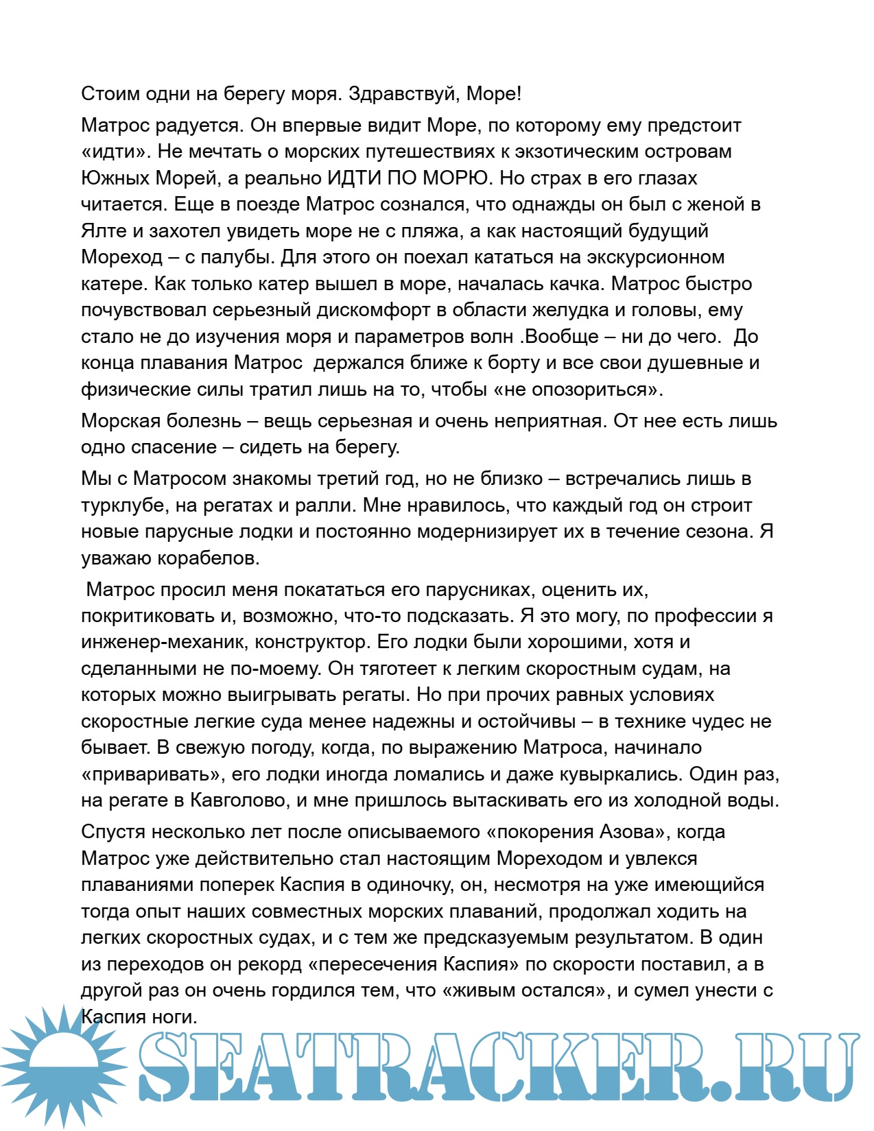 Год выпуска: 2005 Язык: русский Автор: Перегудов В.М. Жанр: История Издательство: ? Формат: PDF/DOCX Качество: Изначально компьютерное (eBook) Количество страниц: 85 Описание: 17.12.1940 - 19.07.2010 Парусный номер M 20. г. Москва Инженер-механик, конструктор по профессии, Перегудов — один из зачинателей и организаторов парусного туризма в стране. Парусным туризмом и постройкой легких разборных яхт занимался с 1962 года. В 1974 году стал первым председателем созданной в Московском городском клубе туристов парусной секции и первые пять лет руководил ее работой. Был организатором и главным судьей «Матчей команд городов» («Осенних регат») на Парусном берегу Московского моря. «Матчи» стали местом встречи туристов-парусников страны, эффективной школой обмена туристским и техническим опытом и сыграли решающую роль в рождении и становлении парусного туризма в СССР. Парусные туристские клубы появились во многих других городах. Объединение туристов-парусников позволило быстро поднять технический уровень туристских судов и обеспечить безопасность плаваний на них. В 1977-1986 годах В.М.Перегудов в рамках московских «Осенних регат» организовал и провел на Парусном берегу 10 ежегодных технических «Конкурсов на лучшие разборные парусно-туристские суда» с публикацией итогов конкурсов и лучших разработок в журнале «Катера и яхты». В 1985 г. он провел на страницах журнала «Турист» заочный конкурс на лучшие вспомогательные паруса для байдарок. В.М.Перегудов был первым пропагандистом превращения самых доступных для туристов лавирующих байдарок в безопасные тримараны с глиссирующими и водоизмещающими боковыми поплавками и опубликовал несколько конструкций таких тримаранов в печати. Много работал над совершенствованием конструкций парусов для легких лодок, разработал парусное вооружение "Стриж". Но Валерий был не только конструктором, но и гонщиком, и испытателем парусных судов. Местами испытаний были, в том числе, Азовское и Каспийское море. Каспий он пересек в 1985 году, пройдя от г. Шевченко до Махачкалы. Один из парусных катамаранов, разработанных Перегудовым, стал прототипом первого промышленного туристского парусного катамарана «Альбатрос». В 1989-1991 годах Валерий Михайлович руководил экспериментальным парусным лагерем на Онежском озере в районе о. Кижи. В.М.Перегудов опубликовал десятки статей на парусную тематику в журналах «Катера и яхты», «Турист» и «Моделист-конструктор». Автор разделов по разборным парусным судам в книгах: В.М.Борисов «Парус на лодке», Ленинград, 1985 г., П.И.Лукоянов «Самодельное туристское снаряжение», Москва, 1986 г. Автор книг: «Туристские разборные парусные суда», Москва, 1987 г., «Парусные байдарки, катамараны, тримараны и надувные лодки», Москва, 2003 г..