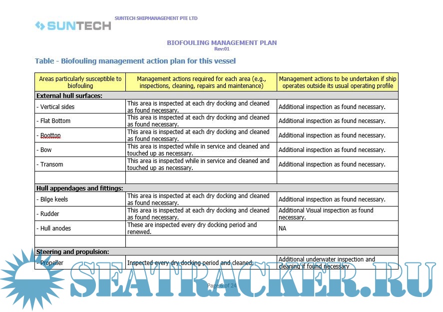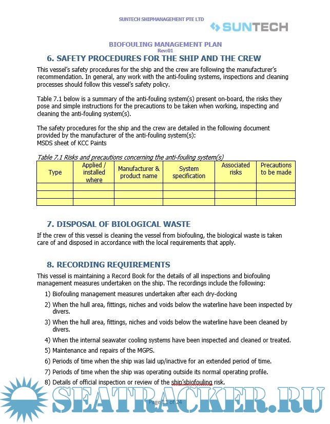 Annex 1 of this plan includes a sample of the Record Book, where this vessel’s crew document activities performed for biofouling maintenance.
