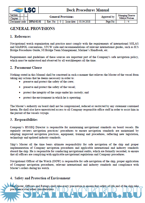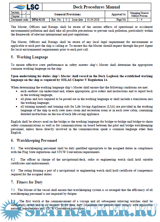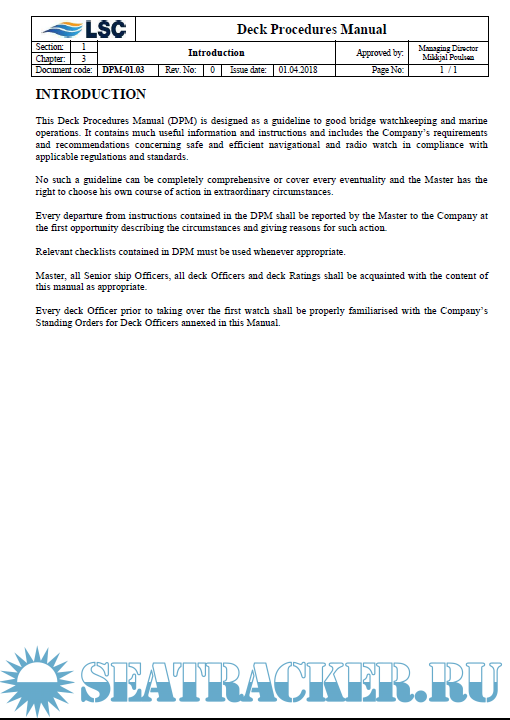 Description: This Deck Procedures Manual (DPM) is designed as a guideline to good bridge watchkeeping and marine operations. It contains much useful information and instructions and includes the Company’s requirements and recommendations concerning safe and efficient navigational and radio watch in compliance with applicable regulations and standards.