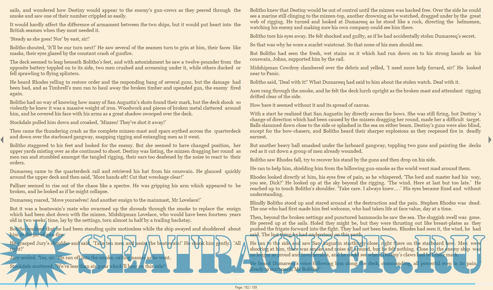 Description: A historical sea novel in which Richard Bolitho, newly appointed Third Lieutenant on the 28-gun frigate Destiny, learns to accept his new responsibilities as a King's officer as the company face the hazards of conspiracy, treason and piracy whilst on a secret mission.
