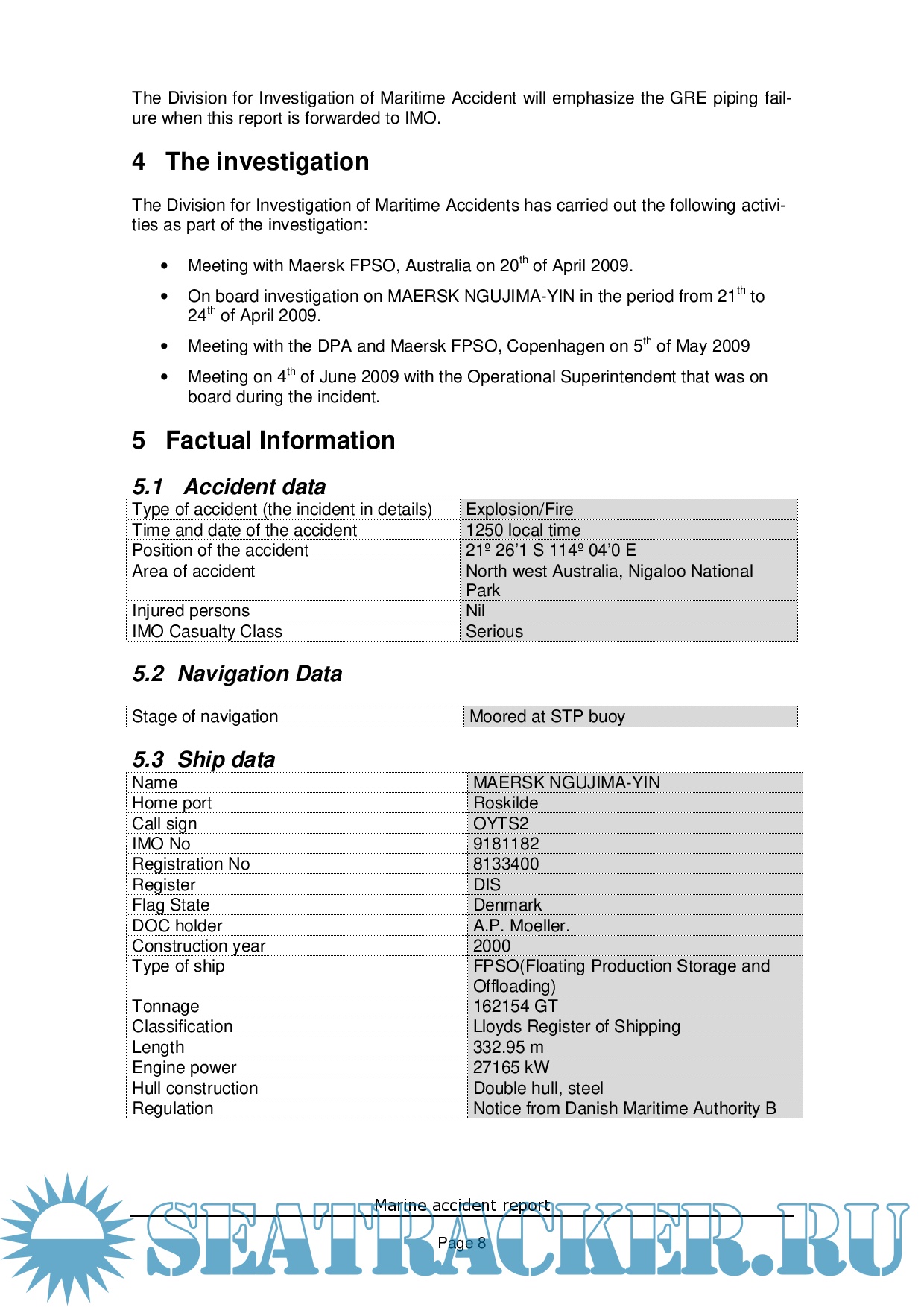 Year: 2009 Language: english Author: Danish Maritime Authority Genre: Documentation Format: PDF Quality: eBook Pages count: 66 Description: MAERSK NGUJIMA-YIN is a FPSO (Floating Production Storage and Offloading). The vessel is operating in the Vincent Field off the cost of North West Australia, Nigaloo National Park. The vessel was originally build in 2000 and served as a VLCC until September 2007. During 2007 and 2008 the vessel was rebuild in Singapore. In June-July 2008 the vessel was commissioned and commenced oil production. At approximately 1250 on the 13th of April 2009 an explosion and subsequent fire occurred in the vessels gas compression module M60 due to a severe breakdown of a 3rd stage HP gas compressor. No persons were injured by the explosion and fire or subsequently during the fire fighting.
