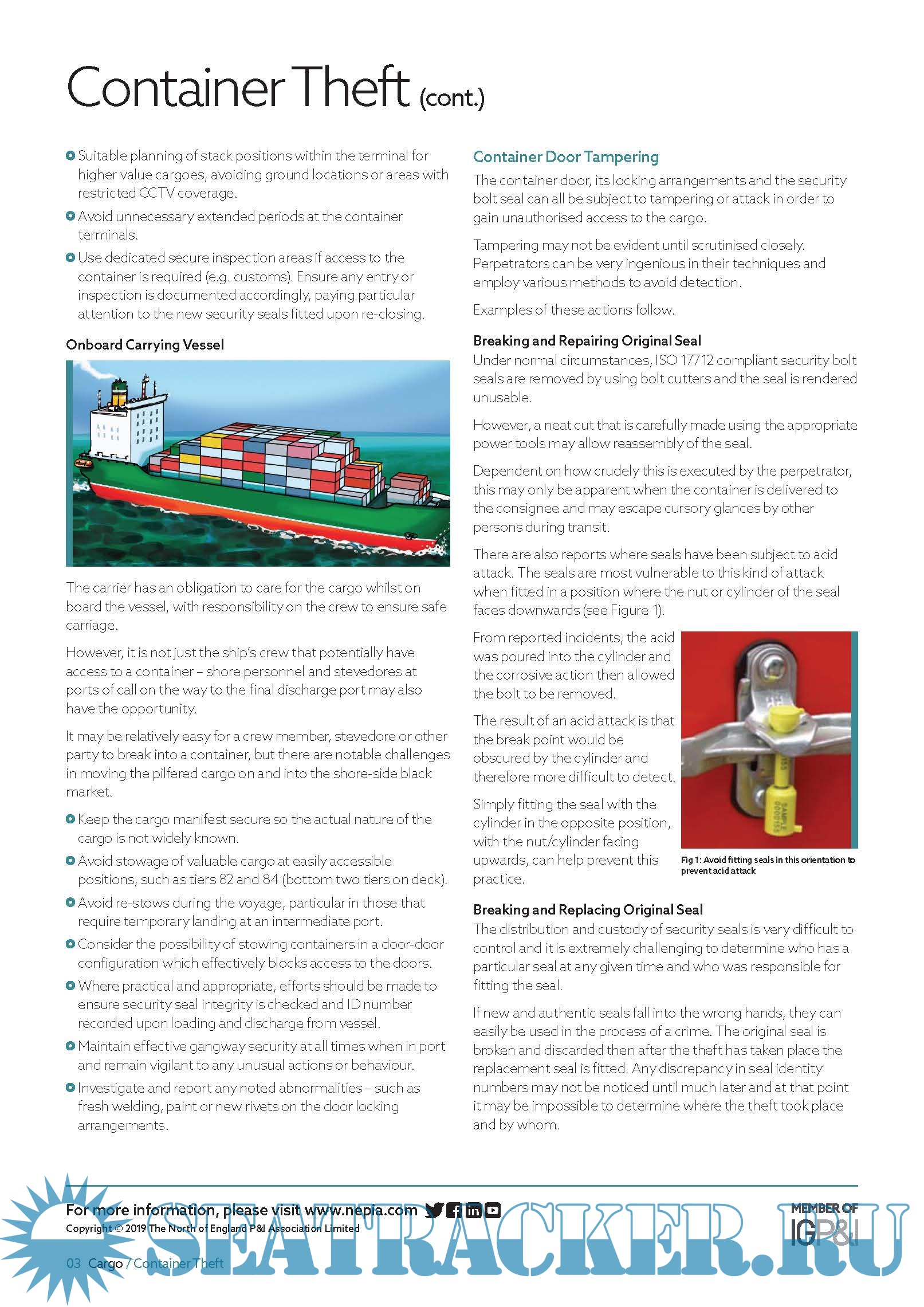 Year: 2021 Language: english Author: the North Genre: Practical guide Format: PDF Quality: eBook Pages count: 7 Description: Attempts to break the security of the chain by criminals may range from opportunistic or casual theft to highly developed and organised theft involving professional criminal networks. Perpetrators may include employees or sub-contractors of the shipper, the terminal or the carrier, or could be someone external that is unrelated to any party. It is also possible that it could involve persons both on the inside and outside working in conjunction – by means of a joint operation or simply by “tipping off”. This briefing examines the links in the secure supply chain, includes points for consideration and provides loss prevention suggestions to prevent theft from containers that may be adopted by the different parties involved.