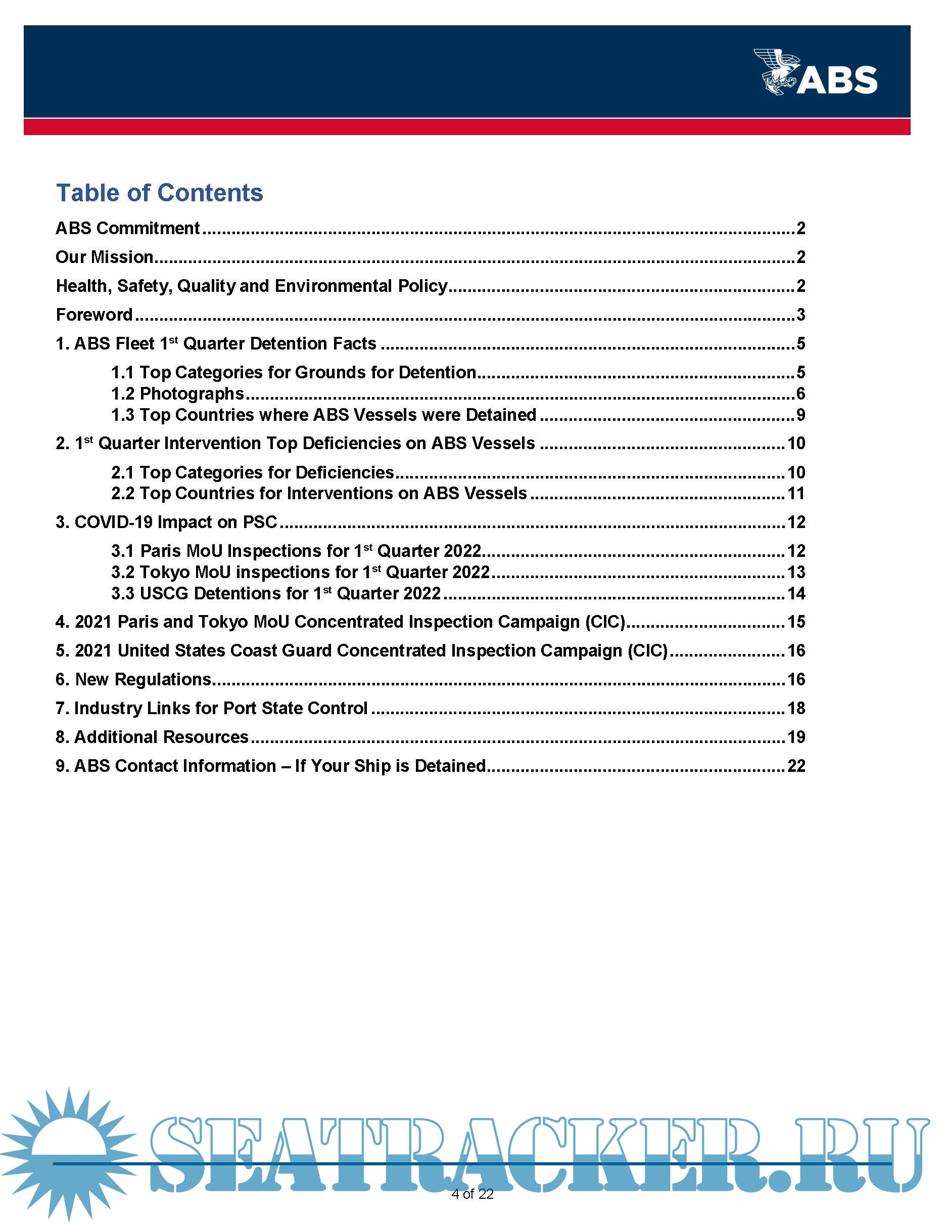 Description: This ABS Quarterly Report on Port State Control (PSC) provides information to owners on deficiencies identified on ABS vessels during inspections carried out by the various PSC regimes globally during the 1st Quarter of 2022. This report is being made available to assist owners by providing awareness of potential areas of concern that have been identified on ABS classed vessels.