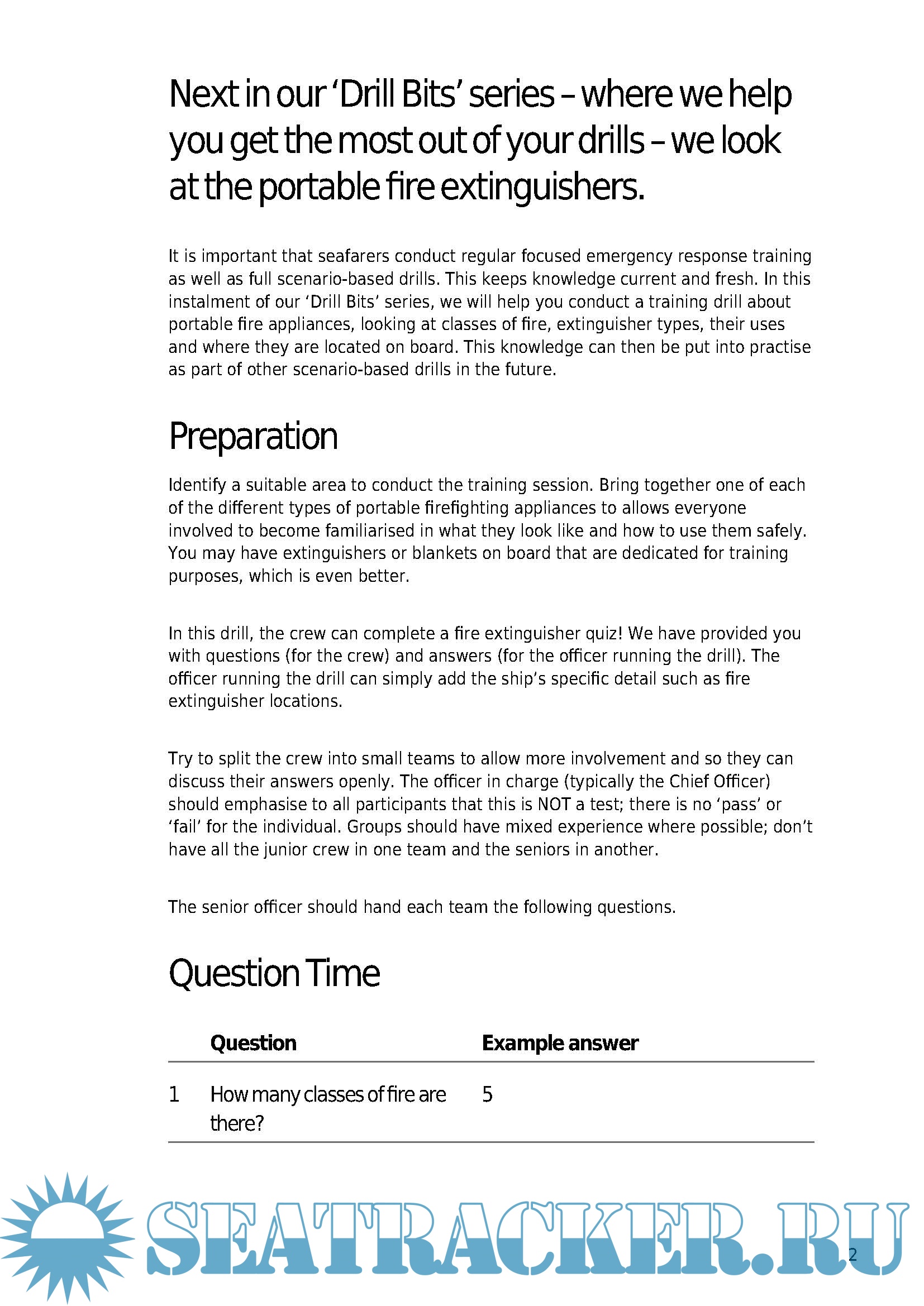 Year: 2022 Language: english Author: the North Genre: Other Format: PDF Quality: eBook Pages count: 7 Description: Next in our ‘Drill Bits’ series – where we help you get the most out of your drills we look at the portable fire extinguishers. It is important that seafarers conduct regular focused emergency response training as well as full scenario-based drills. This keeps knowledge current and fresh. In this instalment of our ‘Drill Bits’ series, we will help you conduct a training drill about portable fire appliances, looking at classes of fire, extinguisher types, their uses and where they are located on board. This knowledge can then be put into practise as part of other scenario-based drills in the future. addition for: