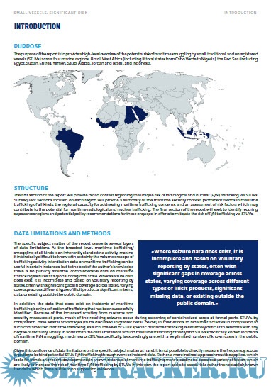 Description: This report, produced with the assistance of the UNODC Global Maritime Crime Programme, examines the potential maritime radiological and nuclear trafficking risks posed by the multitude of small, traditional, and unregistered vessels plying the world’s oceans. The report specifically examines four geographic areas (Brazil, West Africa, the Red Sea, and Indonesia) to assess the risk these types of vessels pose for radiological and nuclear trafficking. It also proposes areas of potential policy prioritization that would increase maritime domain awareness around these kinds of vessels and mitigate the risk of their trafficking activity.