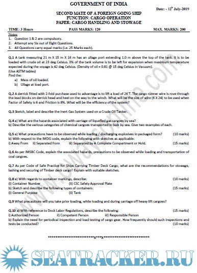 Question Paper Set for Cargo Handling and Stowage (July 2022) for Second Mate (F.G.) Mercantile Marine Department (MMD), India Examinations