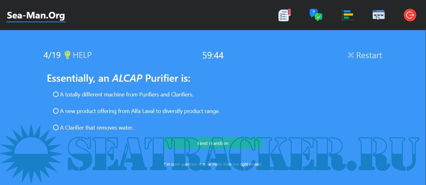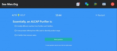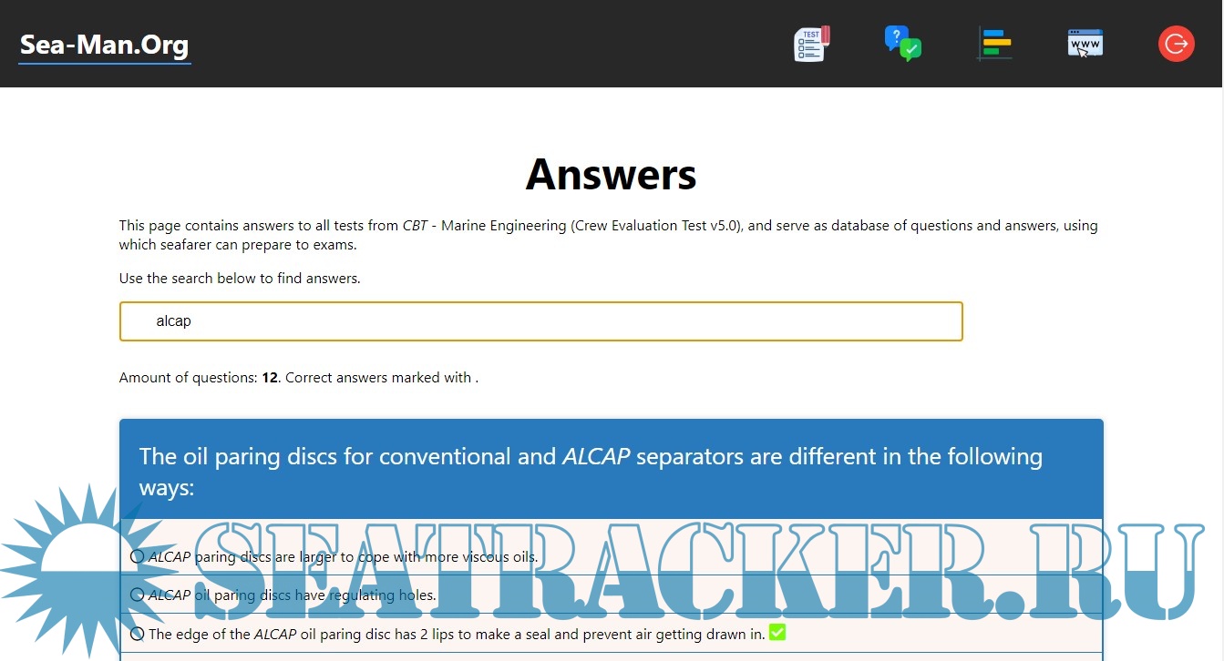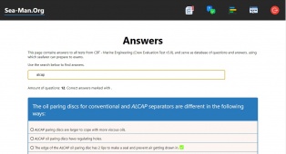 Year: 2022 Version: v1.1.1 Developer: Alex Lestra Platform: Windows 64-bit OS compatibility: yes System Requirements: OS: Windows 7, 8, 10 RAM: 1 GB Graphics: any Storage: 174 mb Localization: english Crack: Not needed Description: Tests from Seagull CES CBT - Marine Engineering (v5.0), which contains 27 tests: AC4 Digital Governor System, AC4 Remote Control System, ALCAP Fuel Oil System, ALCAP Lube Oil System, ALCAP Monitoring and Control, ALCAP Separation Principles, Separators, ALCAP System, Auxiliary Diesel Engines, Basic Hydraulic System, Bilge Water Separator, Auxiliary Boiler Plant, Cooling System, Energy Efficiency in Shipping, Flex Inert Gas Generator System, Flue Gas Plant, Fresh Water Generator, Fuel Combustion Efficiency, Fuel Oil System, On Board Incinerator, TeamTec Incinerator, Inert Gas Generator, Marine Fuel Handling, Marine Lubricants, Pumps and Pumping Operations, Basic Refrigeration Theory, Operation of Steering Gear, Sulzer Medium Speed Diesel Engine. Features: * 27 tests with possibility to pass them and to see your result and errors. * 787 questions and answers from this tests. * rating system, which saves your best results. Installation: 1. Unpack .rar archive anywhere. 2. Launch cbt_MarineEng_en.exe Additional info: For version with russian localization please visit this thread https://seatracker.info/viewtopic.php?t=52964 I am a developer of this program, and I am happy what a lot of people find it useful, and what they asked for version with English UI. This is big motivation for me, thank you. If you find any errors, bugs etc, please let me know here in this thread, or (better) mail me: [email protected] Any suggestions appreciated. With best regards Alex "NarkiDarki" Lestra.
