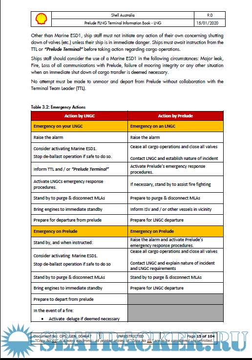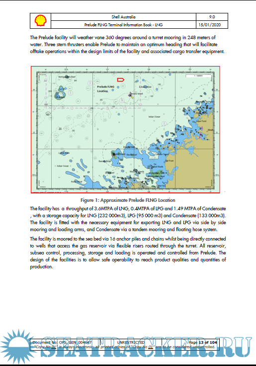 Description: This TIB has been produced to meet the information needs of users (LNG Carriers) of the Prelude Floating Liquefied Natural Gas (FLNG) Terminal (hereafter referred to as Prelude in the Terminal Information book and FLNG Facility in the conditions of use). The Booklet contains general port information, applicable regulations, safe working procedures and emergency response details, together with specific information governing the operations of ships at the Prelude Berths.