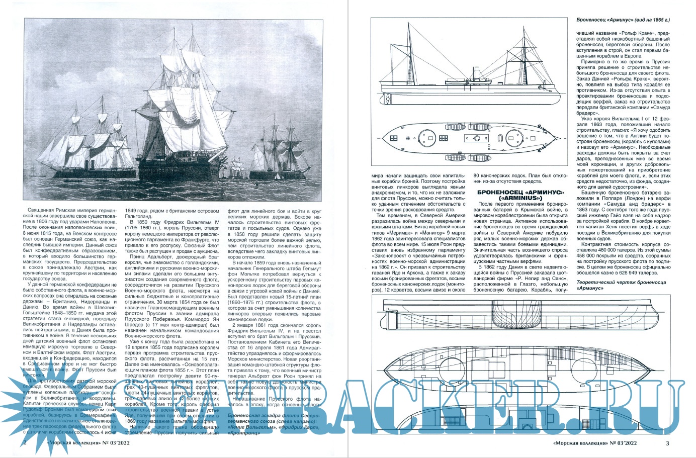 Описание: Выпуск «Морской коллекции» посвящен броненосным кораблям, вступившим в строй или заложенным в период, предшествовавший окончательному объединению Германии и созданию так называемого Второго Рейха. Это время характеризовалось своеобразной «эпидемией», поразившей военных моряков всего мира - стремлением обзавестись броненосцами. Не остались в стороне от гонки военно-морских вооружений и германские государства, на собственном печальном опыте убедившиеся в необходимости иметь в составе вооруженных сил флот, способный обеспечить защиту собственных берегов и, в перспективе, морской торговли. Особенно четко это понимали первые лица Пруссии. С 1866 г. значительная часть германских государств объединилась в Северогерманский союз, причем это надгосударственное образование получило право распоряжаться военными и морскими силами (а также вело единую внешнюю политику). Поэтому, хотя основной вклад в создание военно-морского флота Союза внесло Королевство Пруссия - как самое экономически развитое государство - не следует забывать о чисто формальной стороне вопроса: морские силы считались общесоюзными. Северогерманский союз прекратил свое существование 18 января 1871 г. - после разгрома Франции и присоединения нему южногерманских земель, в т.ч. Баварии, Вюртемберга и Бадена. Кстати, стоит обратить внимание и на еще одно немаловажное обстоятельство: Франко-прусская война отнюдь не была противостоянием «титульных» стран один на один. Хотя прусские войска составляли основную силу объединенной армии, прочие германские государства выставили порядка 25% бойцов. Напоследок нужно отметить и такой момент: третья четверть XIX в. характеризуется чрезвычайно быстрым развитием техники. В то время «свежепостроенные» броненосцы по прошествии всего нескольких лет оказывались как «морально устаревшими», так и совершенно непригодными для борьбы с со своими более новыми «одноклассниками». Эта особенность эпохи напрямую коснулась и описываемых в выпуске кораблей.