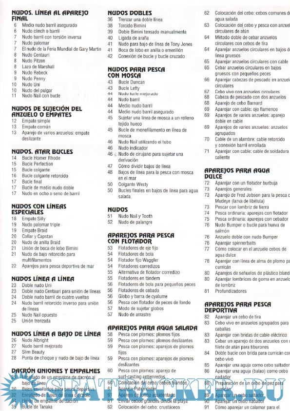 Year: 2004 Language: spanish Author: Wilson G. Genre: Manual Publisher: Tutor Edition: 1st ISBN: 8479024321 Format: PDF Quality: Scanned pages Pages count: 93 Description: A través de explicaciones paso a paso, Geoff Wilson lleva a los pescadores a métodos y procedimientos precisos para realizar algunos de los nudos que las líneas modernas necesitan. Hay capítulos sobre nudos en líneas terminales, lazos, super líneas, bajos de líneas, dracón, líneas dobles, pesca con flotador, pesca con mosca y nudos profesionales. Incluye además una seleción detallada de los mejores aparejos, tanto para agua dulce como salada, así como para pesca deportiva o pesca de altura. Through step-by-step explanations, Geoff Wilson walks anglers through precise methods and procedures for tying some of the knots modern lines require. There are chapters on knots on end lines, snares, super lines, rigs, drake, double lines, float fishing, fly fishing, and professional knots. It also includes a detailed selection of the best tackle, both for fresh and salt water, as well as for sport fishing or deep-sea fishing. С помощью пошаговых объяснений Джефф Уилсон знакомит рыболовов с точными методами и процедурами завязывания некоторых узлов, которые требуются для современных лесок. Есть главы об узлах на концевых лесках, ловушках, суперлесках, оснастках, селезнях, двойных лесках, поплавочной ловле, ловле нахлыстом и профессиональных узлах. Он также включает в себя подробный подбор лучших снастей, как для пресной, так и для соленой воды, а также для спортивной или глубоководной рыбалки.
