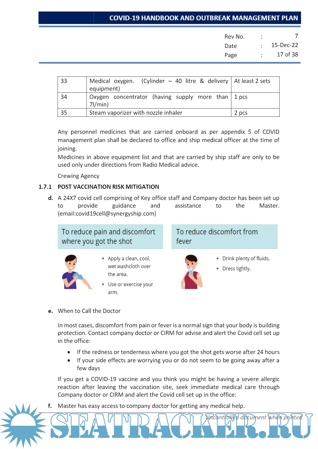 Description: This Covid-19 handbook and outbreak management plan provides procedures to be put in place to prepare Synergy ships for ‘ship-shore” interface and to protect our seafarers from the dangers posed by the new Coronavirus disease (Covid-19). These includes potential exposure from shore personnel and the actions to be taken in the event of a suspected case on board.