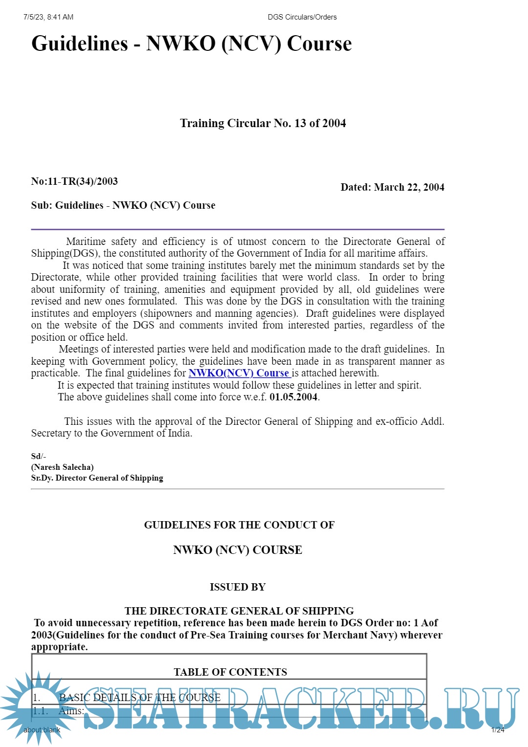 Year: 2004 Language: english Author: D.G. Shipping, India Format: PDF Quality: eBook Pages count: 24 Description: Syllabus for Officer In Charge of a Navigational Watch (Near Coastal Voyages) (NWKO NCV) Course Mercantile Marine Department (MMD), India Examinations. Objectives: The objective of this course is to prepare a candidate to appear for the examinations ofCertificate of Competency as NWKO (NCV). Aims: This course covers part of the education and training required under Regulation II/1 (NCV) andaims to meet the standards of competence specified in Section A-II /1 (NCV) of the STCW 95. Appendix M-II/5C of META Manual Vol. II should be used in the preparation of material for this course.