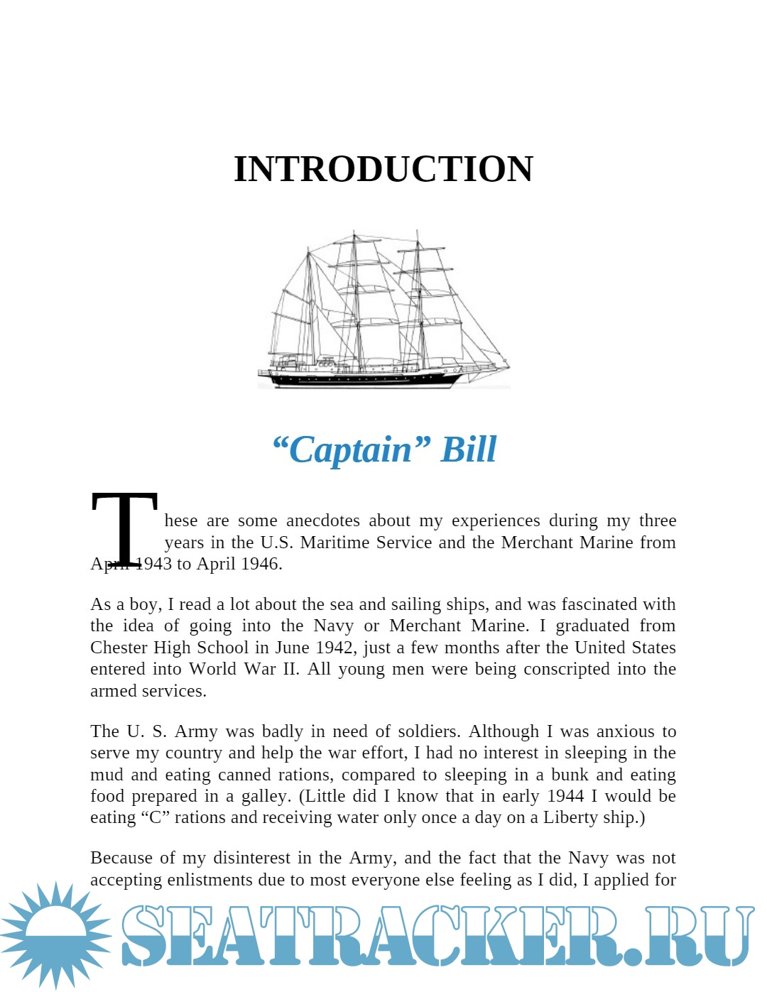 Description: The author, Bill Snell, graduated from the United States Merchant Marine Academy in 1944. He sailed as Second Mate and Third Mate in the Atlantic and the Mediterranean during the Second World War, and in the Caribbean after the war. “Captain” Bill is the story of his adventures at sea, serving as an officer on Liberty Ships, which were the backbone of the transport of the armaments and supplies needed to fight the greatest war in history