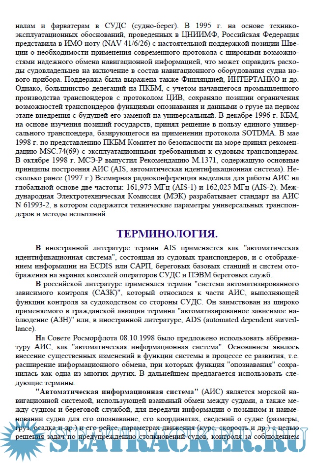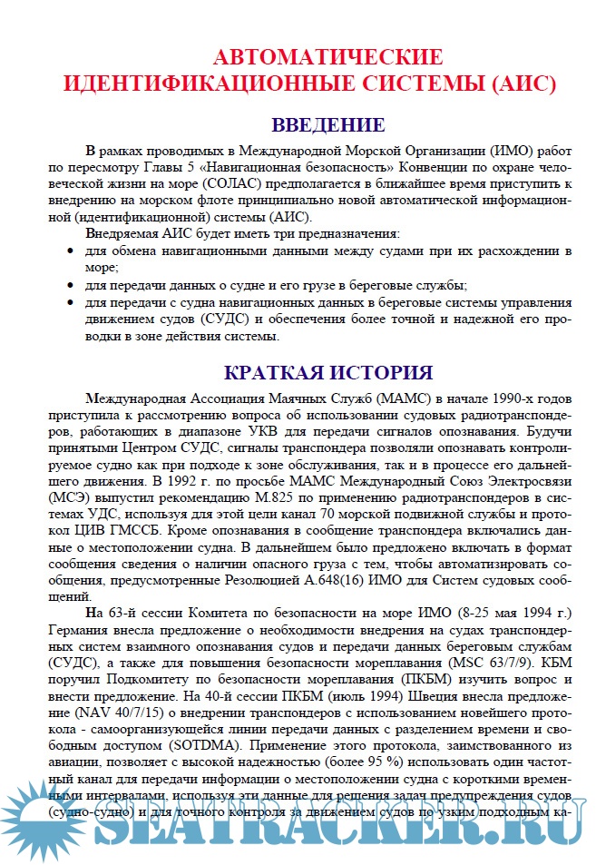 Описание: В рамках проводимых в Международной Морской Организации (ИМО) работ по пересмотру Главы 5 «Навигационная безопасность» Конвенции по охране человеческой жизни на море (СОЛАС) предполагается в ближайшее время приступить к внедрению на морском флоте принципиально новой автоматической информационной (идентификационной) системы (АИС).