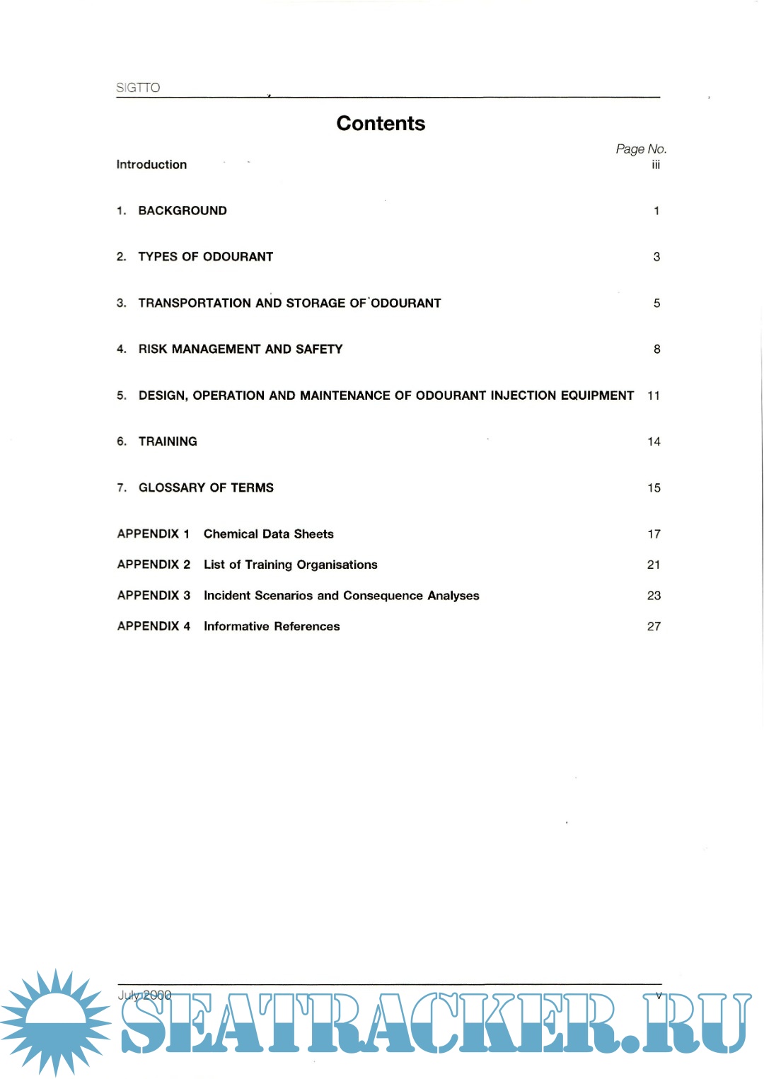 1. Background 2. Types of Odourant 3. Transportation and Storage of Odourant 4. Risk Management and Safety 5. Design, Operation and Maintenance of Odourant Injection Equipment 6. Training 7. Glossary of Terms Appendix 1 Chemical Data Sheets Appendix 2 List of Training Organisations Appendix 3 Incident Scenarios and Consequence Analyses Appendix 4 Informative References