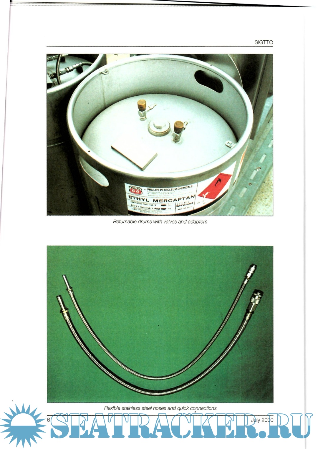 It is supported by photographs and diagrams that illustrate safe transportation and storage of gas odourants. It also includes a table that outlines material compatibility with ethyl mercaptan odourant.