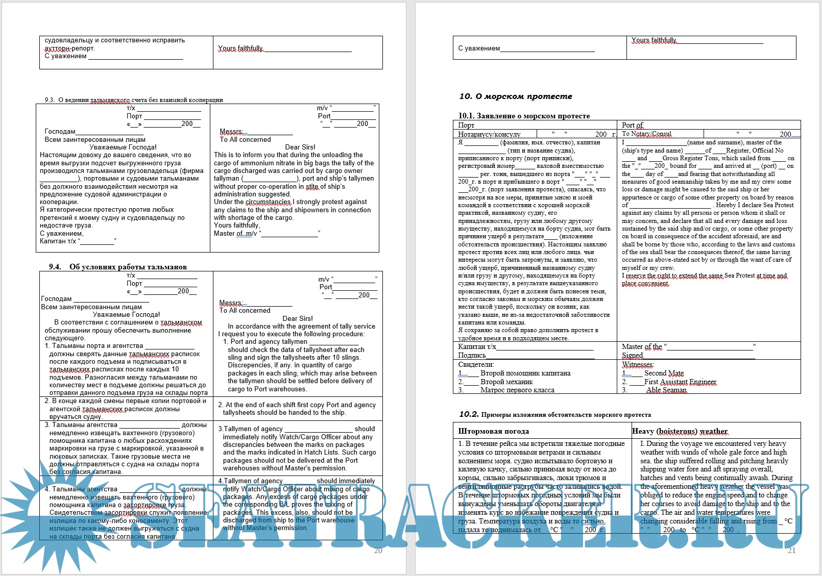 ВВЕДЕНИЕ I. Образцы деловых писем и документов капитана 1. Извещение капитана о готовности судна (нотис) 2. Письмо капитана о доставке документов, подтверждающих судовые расходы 3. Запрос справки о стомости спасенных сумм при заходе в порт без использования лоцмана, буксиров и отказа от услуг швартовщиков. 3.1. Пример справки о стомости спасенных сумм при заходе в порт без использования услуг швартовщиков 4. Об ускорении грузовых работ 4.1. О заказе сверхурочной работы 4.2. Об ускорении выгрузки (погрузки) 4.3. Об истечении сталийного времени 4.4. О выходе судна на демередж 5. Доверенности агенту 5.1. Письмо-доверенность агенту на подписание коносамента 5.2. Письмо-доверенность агенту на подписание Генерального акта. 6. Письма протеста при наличии претензий к качеству груза поданного к погрузке. 6.1. О плохой упаковке поданного к погрузке груза 6.2. Акт о непринятии груза в связи с подачей его в нетранспортабельной таре 6.3. О фумигации груза в трюмах 7. Письма протеста при претензии к количеству или качеству груза после выгрузки 7.1. Письмо-протест при недостаче груза после выгрузки 7.2. Письмо-протест против недостачи при определении количества груза в порту выгрузки по электронным весам 7.3. Письмо-протест против недостачи при неизвестности метода определения количества груза в порту выгрузки 7.4. О повреждении груза докерами 7.5. О хищении груза докерами 7.6. О повреждениях, нанесенных судну во время перегрузочных операций 7.7. Об окончании устранения поломок, произведенных при выгрузке 8. Пломбировка трюмов 8.1. Акт пломбировки 8.2. Акт распломбировки 8.3. Об отказе подписания акта распломбировки трюмов 8.4. О недостаче груза при пломбировке трюмов 9. Тальманство 9.1. О найме тальманов для счета груза 9.2. О недостаче груза и организации его пересчета 9.3. О ведении тальманского счета без взаимной кооперации 9.4. Об условиях работы тальманов 10. О морском протесте 10.1 Заявление о морском протесте 10.2. Примеры изложения обстоятельств морского протеста 10.3. Акт о морском протесте 11. Акт осадки судна II. Образцы писем-заявок, заказов, протестов 1. Заявка на снабжение судна водой 2. Заявка на водолазный осмотр судна 3. Заявка на поставку необходимых карт 4. Заявка на организацию ремонтных работ 5. Письмо агенту с просьбой получить разрешение портовых властей на ремонт главного двигателя 6. Заявка о направлении на судно сюрвейера 7. Письмо в случае разлива нефти при бункеровке 8. Письмо в случае попытки обвинить судно в загрязнении моря нефтью 9. Письмо капитану судна, с которым произошло столкновение 10. Письмо в ответ на письмо капитана иностранного судна об ответственности за столкновение 11. Письмо капитану иностранного судна после осмотра сюрвейера 12. Письмо капитану иностранного судна о передаче спора в морскую арбитражную комиссию (МАК) 13. Письмо агенту с требованием добиться задержания (ареста) иностранного судна, виновного в столкновении 14. Письмо агенту о навале судна на причал с просьбой пригласить сюрвейера 15. Письмо, подтверждающее окончание устранения нанесенных повреждений III. Русско-английский словарь основных терминов 1. Грузовые работы 2. Оформление грузовых документов 3. Оговорки коносамента 4. Ремонт 5. Наиболее употребляемые названия судового оборудования, инвентаря, инструментов, материалов, частей механизмов и т.д. 6. Контейнер 24