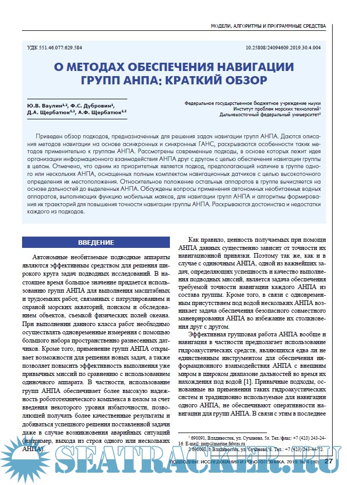 СОДЕРЖАНИЕ СИСТЕМЫ, ТЕХНОЛОГИИ И ЭКСПЕРИМЕНТЫ 4 Коноплин А.Ю., Денисов В.А., Даутова Т.Н., Кузнецов А.Л., Московцева А.В. Технология использования ТНПА для комплексного исследования глубоководных экосистем МОДЕЛИ, АЛГОРИТМЫ И ПРОГРАММНЫЕ СРЕДСТВА 13 Елисеенко Г.Д., Инзарцев А.В., Павин А.М. Программная платформа для построения распределенных систем управления морских роботизированных комплексов 21 Спорышев М.С., Щербатюк А.Ф. О некоторых алгоритмах решения задачи патрулирования подводной среды с помощью группы взаимодействующих АНПА 27 Ваулин Ю.В., Дубровин Ф.С., Щербатюк Д.А., Щербатюк А.Ф. О методах обеспечения навигации групп АНПА: краткий обзор СРЕДСТВА И МЕТОДЫ ПОДВОДНЫХ ИССЛЕДОВАНИЙ 37 Касаткин Б.А., Злобина Н.В., Касаткин С.Б. Пограничные волны в проблеме обнаружения подводных источников шума 49 Кузькин В.М., Матвиенко Ю.В., Переселков С.А. Применение интерферометрической обработки для локализации малошумных источников звука 58 Хворостов Ю.А., Матвиенко Ю.В. Характеристики собственного шумоизлучения малогабаритного АНПА 64 Захаров А.Н., Белобловский В.Н., Полищук С.В. Определение спектрального состава подводного шума движителя необитаемого подводного аппарата 71 Рефераты