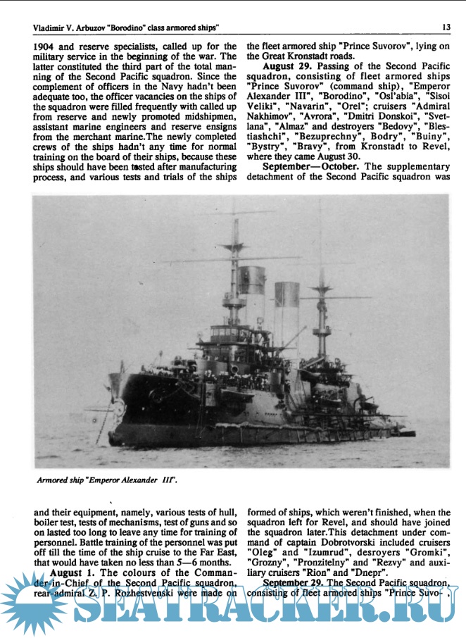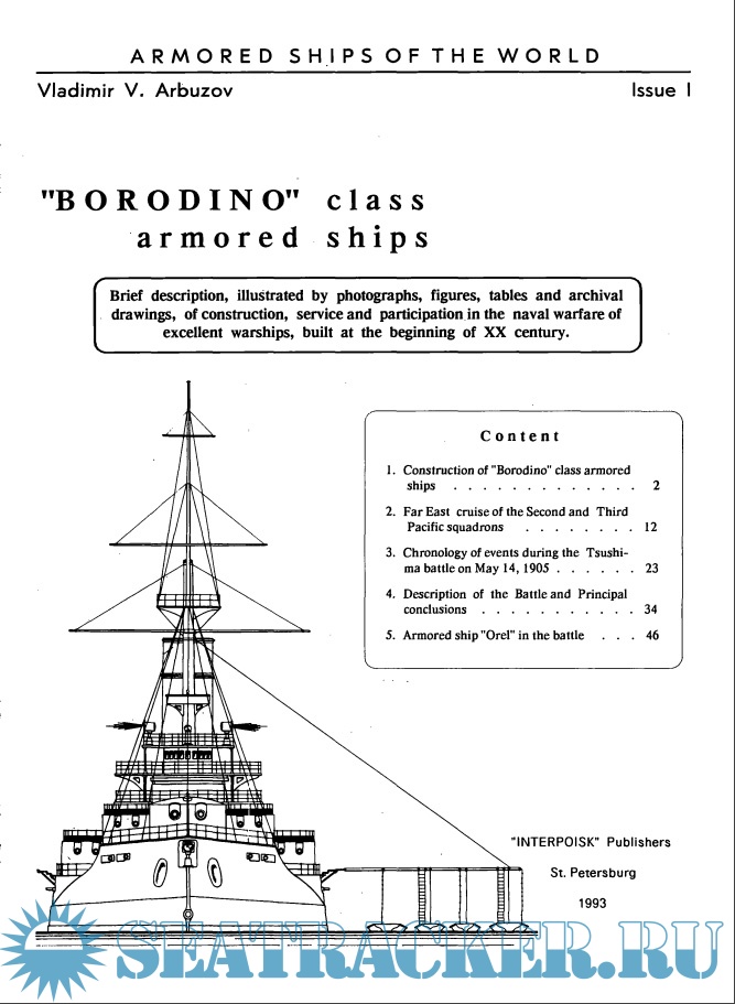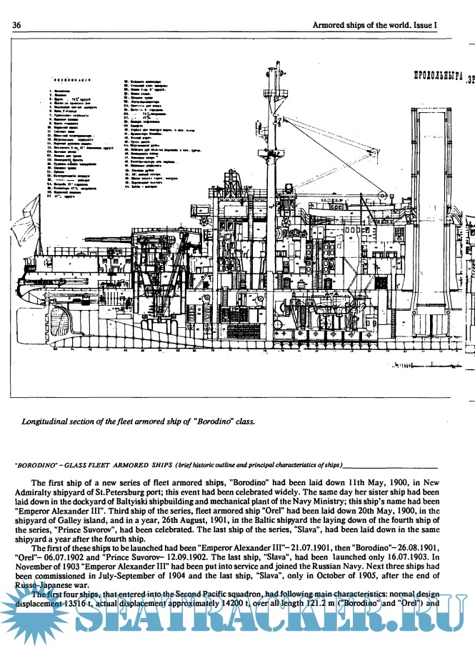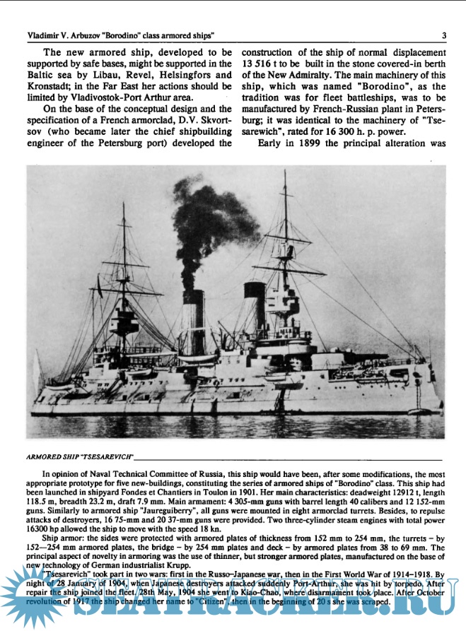 Description: In 1898—1899 battleships of "Borodino"class had been still in process of development while all the principal elements of their future adversaries — Japanese armorclads of "Shikishima" class — had been determined already, though not yet detailed. In December 1898 heads of the Russian Naval Department, after careful examination of various armored ship projects by the Naval Technical Committee (NTS), made a choice of the French engineer A. Lagagne project, who was building "Tsesarewich" in Toulon at that time.