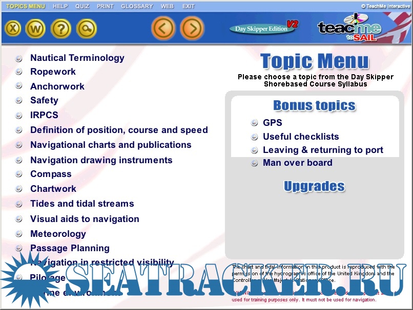 Year: 2004 Platform: Windows XP, Vista, 7 Compatibility with Windows7: yes System Requirements: Системные требования: Windows XP, Vista, 7 604 mb на диске 128 mb RAM 800x600 и выше Localization: english Crack: Not needed Description: Интерактивный обучающий курс RYA для подготовки и сдачи экзаменов уровня DS & CS, включая тесты по всем основным темам. Не требует инсталяции, просто запустить Main.exe Доп. информация: www.rya.org.uk