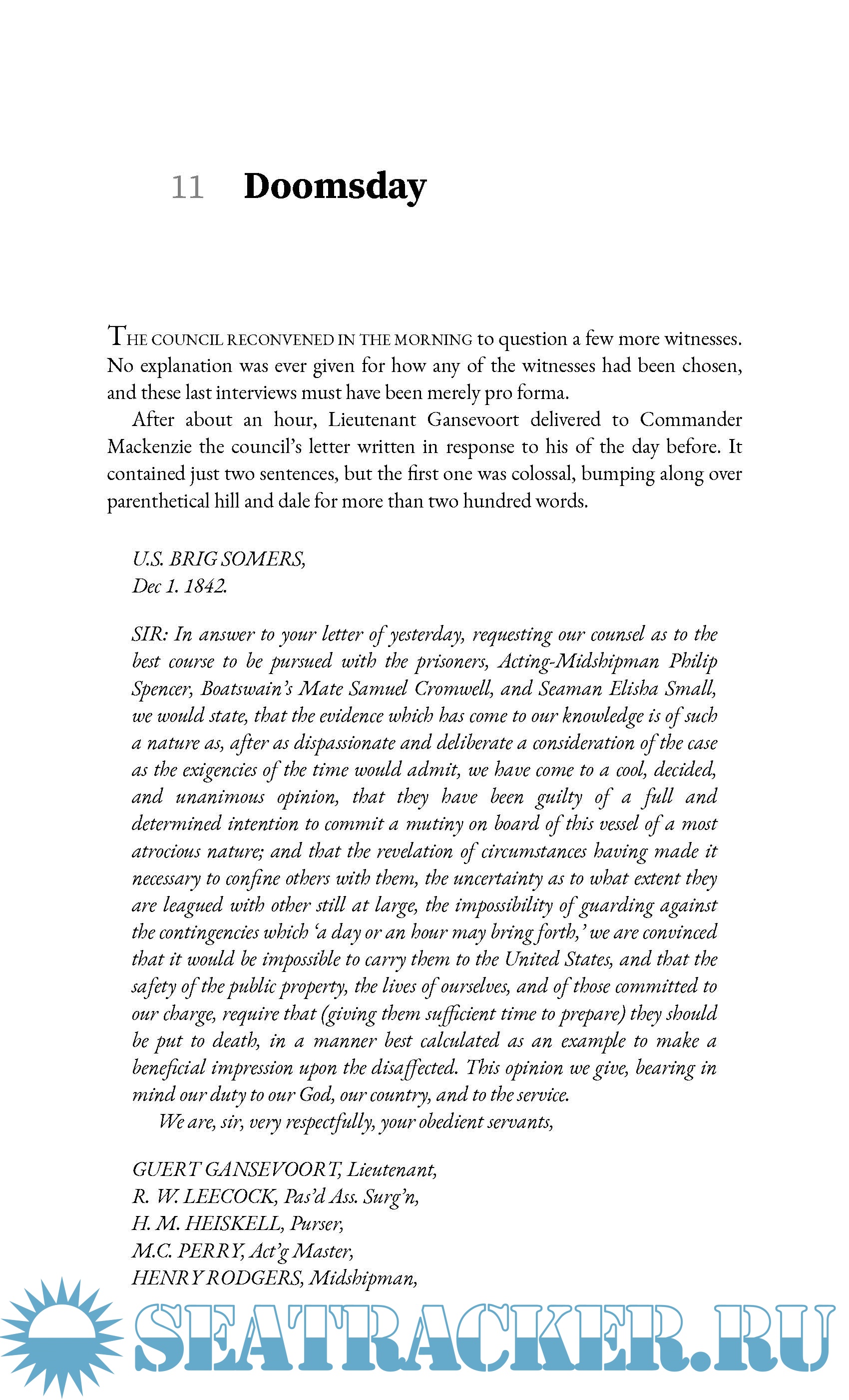 Months of accusations and counteraccusations were followed by a highly public court martial which put Mackenzie on trial for his life, and a storm of anti-Navy sentiment drew the attention of the leading writers of the day (Washington Irving thought Mackenzie a hero; James Fenimore Cooper damned him with a ferocity that still stings). But some good did come out of it: public disgust with Mackenzie’s training cruise gave birth to Annapolis, the place that within a century, would produce the greatest navy the world had ever known.