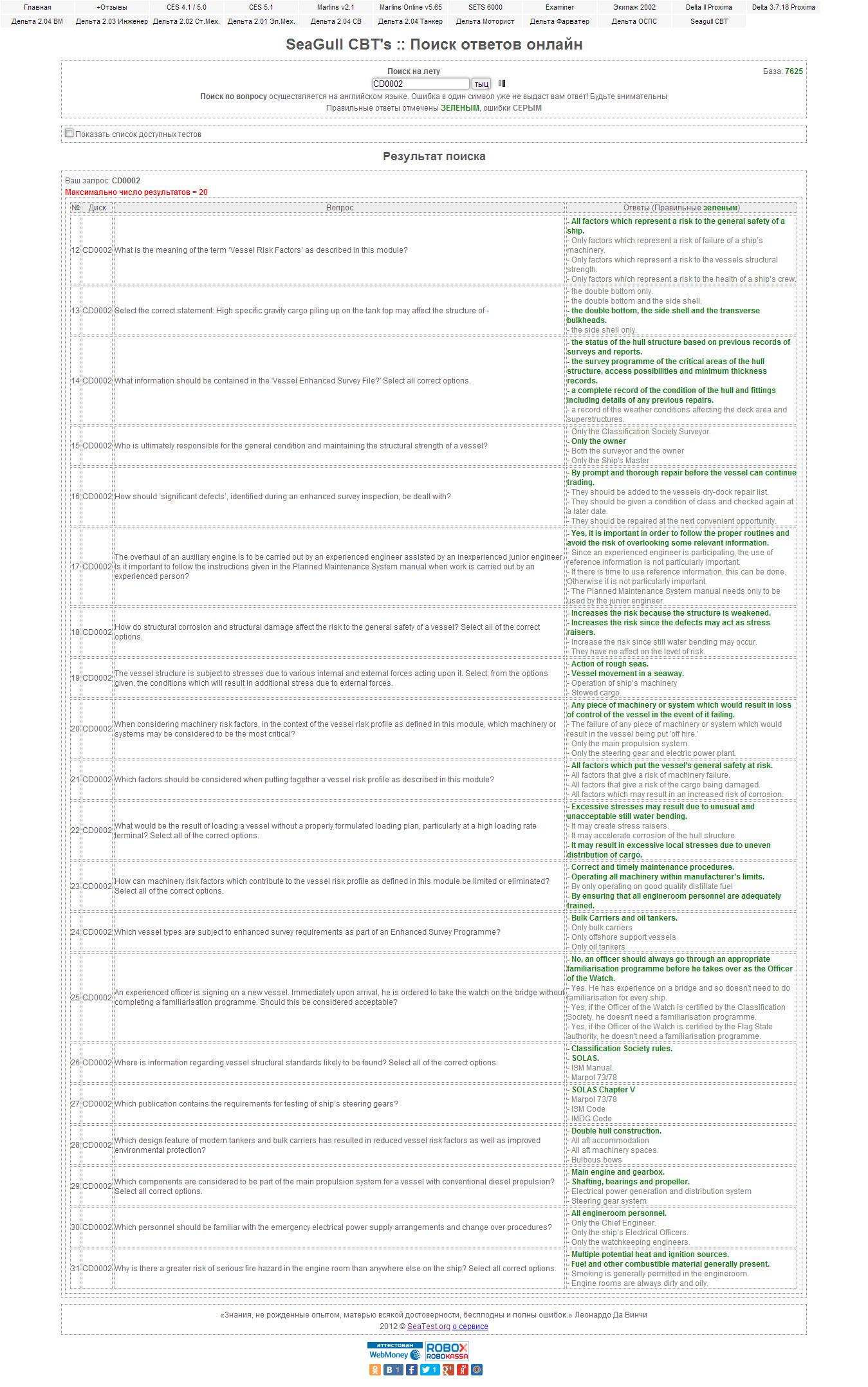 Обращаюсь к тем, кто сталкивался с подобной проблемой при поиске готовых ответов. В таких cbt, как: 251 (culture), 186 (ship to ship), 156 (piracy) - при поиске ответов на поставленные вопросы ничего не сходится (хотя на все три теста в интернете есть ответы). Возможно, это обновлённые варианты этих тестов, где уже другие вопросы и другие ответы? Онлайн ответы - тоже всё не то. Был бы благодарен за информационную помощь в ближайшие дни.