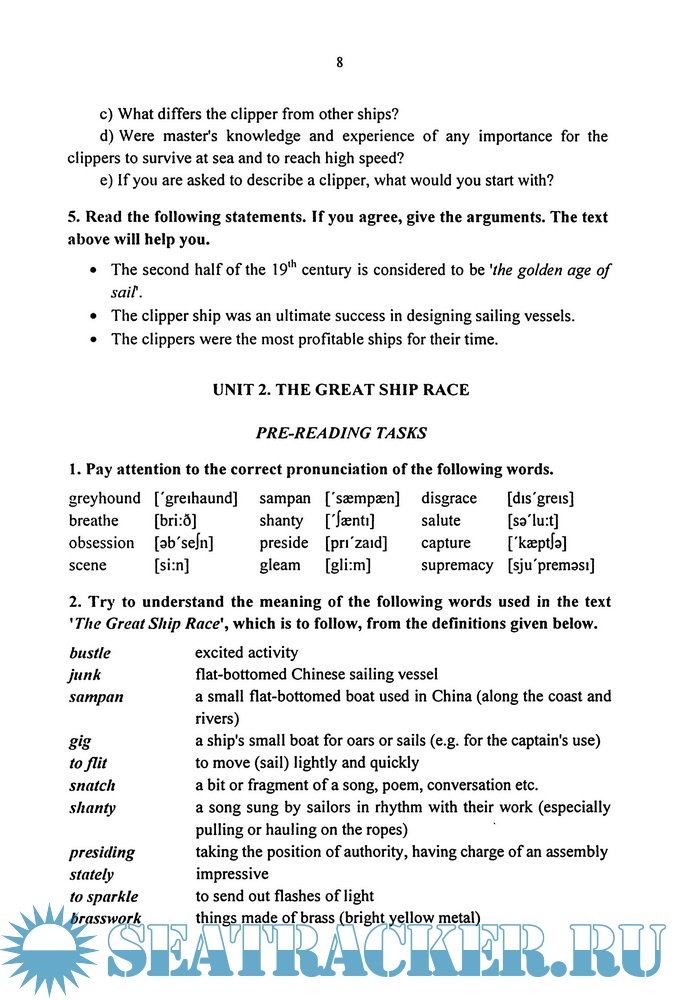 Данное учебное пособие рекомендуется к изучению курсантами 2 курса во время плавательской практики на УПС "Седов". Учебное пособие включает тексты из оригинальных источников, объединённых единой тематикой. Предтекстовые задания облегчают понимание текста, обучают правильному чтению незнакомых лексических единиц. Послетекстовые упражнения направлены на развитие умений и навыков ведения беседы по темам прочитанных текстов, дают возможность повторить грамматический материал и увеличить словарный запас по морской тематике. В учебное пособие включены упражнения на развитие навыков просмотрового чтения, на умение извлекать информацию и применять её во время обсуждений. Большое внимание уделяется упражнениям на развитие речемыслительной деятельности курсантов, подготовке их к общению с зарубежными гостями, с людьми, говорящими только по-английски.