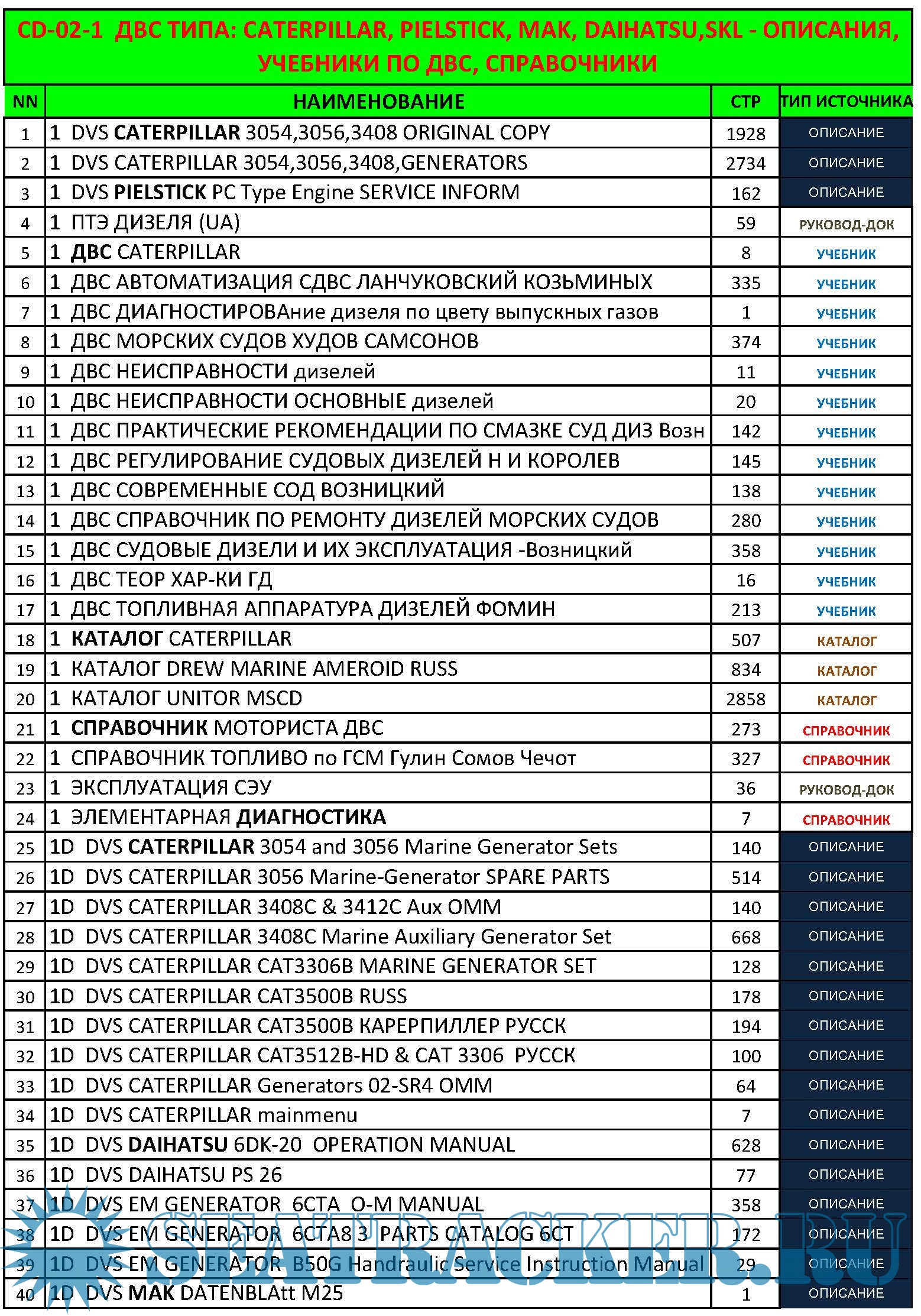 ДИСК СОДЕРЖИТ УЧЕБНИКИ,СПРАВОЧНИКИ А ТАКЖЕ ОРИГИНАЛЬНУЮ ДОКУМЕНТАЦИЮ ПО ДВС ТИПА CATERPILLAR, MAK,DAIHATSU,PIELSTICK,SKL С ЧЕРТЕЖАМИ, ОПИСАНИЯМИ,ПРЕЗЕНТАЦИЯМИ,НОВЫМИ ДОКУМЕНТАМИ