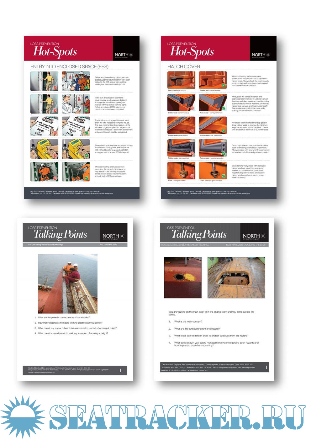 Year: 2016 Language: english Author: The North of England P&I Association Limited Genre: Practical guide Publisher: The North of England P&I Association Format: PDF Quality: eBook Description: There are some Hot-Spots sheets and Talking-Points guidances issued by The North of England P&I Association Limited as Loss Prevention Publications. Talking Points' will assist Masters and Safety Officers when preparing for onboard safety meetings by raising awareness of the common causes of accidents and incidents by providing an image or object to use as a 'talking point' to introduce the safety topic. The first page can be distributed to those attending safety meetings or safety briefings whilst the meeting co-ordinator can refer to page two for guidance. Hot-Spot' sheets are published as a loss prevention tool to provide practical hints and tips to help avoid incidents, claims and Port State deficiencies, or help to prepare for inspections and surveys. They are designed to be placed with spares or alongside equipment where they can provide a quick reference to all, they are not intended to be filed.