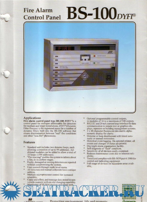 Fire alarm control panel type BS-100 DYFI ®is a control panel for analogue addressable fire detectors for medium and larger installations. DYF!'( Dynamic Filter Process) is the registered name for a number of dynamic fillers built into the BS-100 software that ensure discrimination between "real" fire conditions and otlier "non-fire" phenomena. . Features Standard unit includes two detector loops, each allowing connection of up to 99 addresses.