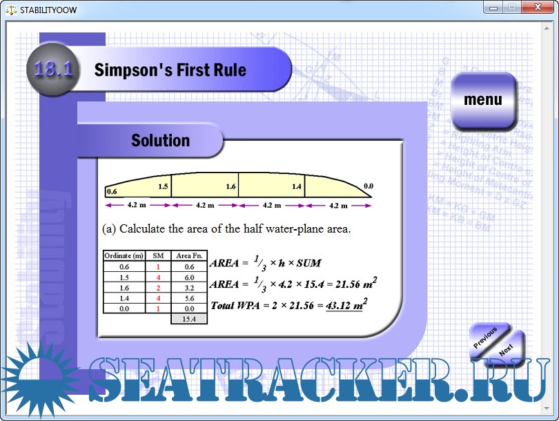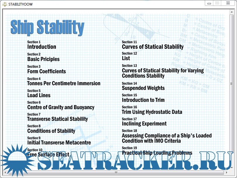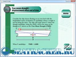 The purpose of including the more advanced material is primarily one of giving the program a suitable ending. To only cover those topics necessary to pass the OOW level examinations would be like writing a book but missing out the last chapter! Sections 16-19 take the learner beyond the scope of the OOW level requirements to allow the learner to be able to complete a full ship load problem using the ship stability data book developed for this purpose. These final sections will be invaluable to anyone preparing themselves for the more advanced Class 2/1 Ship Stability examinations. A second CD- ROM is currently being developed for the higher level Class 2/1 candidate.