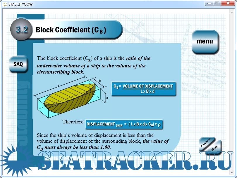 A trend in recent years in the education of professional seafarers has been to reduce the time that the student actually spends in college and for the introduction of a more structured learning experience whilst the student is actually at sea. With most educational establishments there is an urgency to develop 'distance learning' based courses. This trend is likely to become more popular with students undertaking academic training courses, but one that is also setting a real challenge to lecturers, like myself. Traditional classroom teaching techniques will always have a place in the education of seafarers. However, with the growing availability of PC access on board modem ships it is envisaged that, with the aid of appropriate software, students will be more able to prepare themselves for the short periods of very intense study required of them during their college phases. This software is specifically designed for this purpose. It is my experience that many students, resulting from their lack of mathematical ability, often meet the subject of ship stability with apprehension. This is the main reason for the downfall of many students studying this topic. This program is designed to address this problem by covering the subject content in the simplest way possible and at an assumed mathematical level that is appropriate for a learner studying independently. Worked examples and self-assessment questions (SAQ's) are provided throughout for the learner to assess his her progress. At the end of each section tutorial questions are provided with solutions fully worked out. All such questions are designed to be of a type and standard that are likely to be encountered in real examinations at OOW level. It is this approach which gives this work an added advantage over most modem text books on the subject of ship stability, were a high level of mathematical ability is often assumed. It has often been the experience of many students to encounter worked examples in text books that are not sufficiently broken down to enforce proper understanding. Formulae are derived where appropriate to enhance understanding. Look through the contents of the program that follows. Those highlighted in blue must be studied for the OOW level examinations.