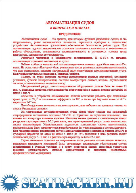 Описание: Автоматизация судов — это процесс, при котором функции управления судном и его оборудованием, ранее выполнявшиеся человеком, передаются приборам и техническим устройствам. Автоматизация судовождения обеспечивает безопасность рейсов судов. При автоматизации судовых энергетических установок повышается надежность и экономичность работы оборудования, увеличивается производительность и улучшаются условия труда плавсостава, сокращается его численность.