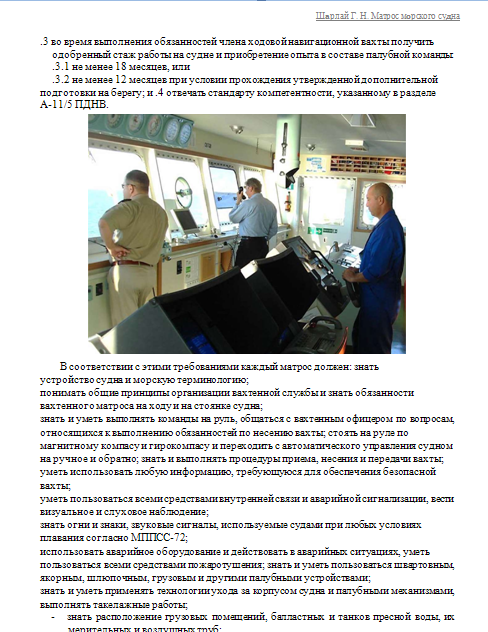Введение 4 Глава 1 Устройство и основные характеристики судна 8 1.1 Классификация судов 8 1.2 Конструкция корпуса морских судов 16 1.3 Основные характеристики судна 19 1.4 Некоторые определения 26 Глава 2. Вахтенный матрос 29 2.1. Организация вахтенной службы 29 2.2. Обязанности вахтенного матроса 31 2.3. Международные правила предупреждения столкновений судов (МППСС-72) 38 2.4. Средства связи и сигнализации 52 Глава 3. Элементы навигации 62 3.1. Мореходные приборы и инструменты 62 3.2. Основные понятия навигации 70 3.3. Морские навигационные карты 73 3.4. Средства навигационного оборудования 76 Глава 4. Навигационная гидрометеорология 80 4.1. Ветер. Общая циркуляция атмосферы 80 4.2. Волнение 82 4.3. Морские течения 86 4.4. Приливы 88 4.5. Облака 89 4.6. Морской лед 92 4.7. Судовые гидрометеорологические приборы и инструменты 93 Глава 5. Морская практика 96 5.1. Организация судовых работ 96 5.2. Тросы 101 5.3. Морские узлы 106 5.4. Такелажное оборудование 110 5.5. Окрасочные работы 113 5.6. Эксплуатация трапов и сходен 123 Глава 6. Судовые устройства 128 6.1. Рулевое устройство 128 6.2. Якорное устройство 132 6.3. Швартовное устройство 146 6.4. Буксирное устройство 155 6.5. Грузовое устройство 161 6.6. Судовые системы 184 Глава 7. Борьба за живучесть судна 187 7.1. Система управления безопасностью 187 7.2. Организация действий экипажа при чрезвычайных ситуация на судне 189 7.3. Обучение и подготовка экипажа к борьбе за живучесть судна 191 7.4. Борьба за непотопляемость судна 195 7.5. Пожарная безопасность судна 204 7.6. Предотвращение загрязнения моря 218 7.7. Действия экипажа при нападении пиратов 220 7.8. Зайцы на судне 222 Глава 8. Судовые спасательные средства 224 8.1. Индивидуальные спасательные средства 224 8.2. Коллективные спасательные средства 229 8.3. Вспомогательные спасательные средства 244 8.4. Спасение людей с терпящего бедствие судна 245 8.5. Выживание спасающихся на море 255 Глава 9. Первая медицинская помощь 261 Список литературы 283