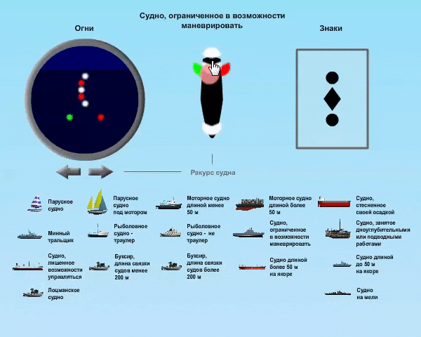 Описание: Программа для изучения ночных огней и дневных сигналов судов.