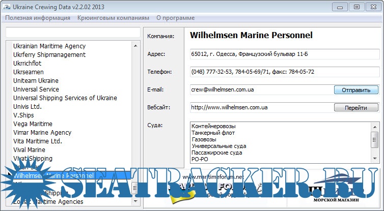Описание: Ukraine Crewing Data - это бесплатный электронный справочник по основным крюинговым компаниям Украины. (Адреса, телефоны, e-mails, web-pages, типы судов). Удобный и быстрый поиск. Программа для тех, кто так или иначе связан с крюинговым бизнесом. Новая версия Март 2015!