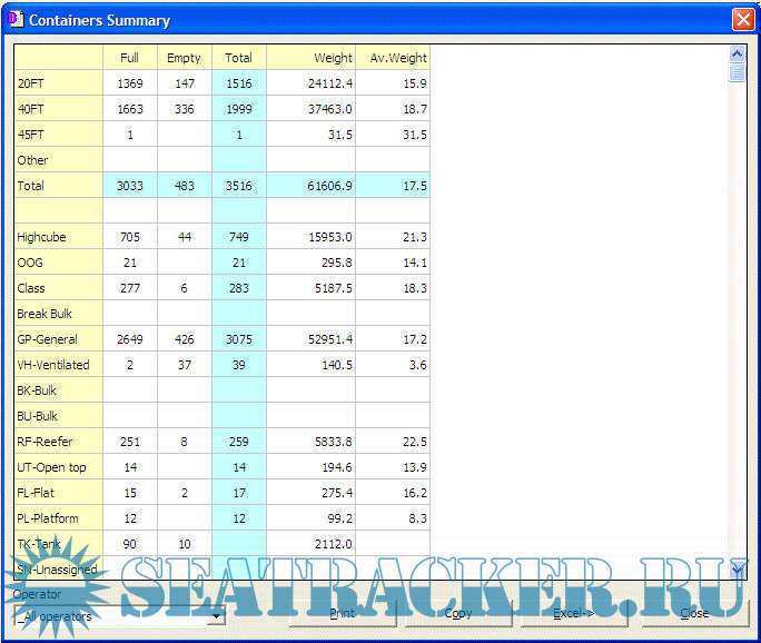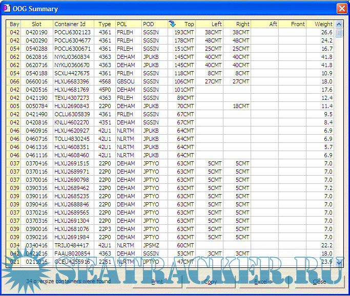 BV can handle standard BAPLIE files with and without line ends (see Remove line feed for explanation). BV can be used on any container vessel, regardless of number of bays, rows, and tiers. Number of containers, discharging ports are limited only by computer memory and BAPLIE file limitation. One floppy disk of 1.44 Mb may contain about 10000 containers, number will vary depending of size of information accompanying reefer and class containers. BV can filter, sort, print reports, find container and store last 4 working conditions for fast retrieval. Decoded files can be exported as DBF (dBase IV), CSV (comma separated value) and TXT (text files TAB delimited). BAPLIE file can be converted for use with to Easeacon@ stability program. Baplie Viewer can export container data to Excel sheet using preset template. What is BAPLIE? BAPLIE is set of instructions stored in text file, used to transmit information about all occupied places on board of a vessel to interested parties like ship-owner and the terminal operator in next port of call. Although the message is also suitable to transmit information about empty places this feature is not used. In generally, only complete messages “BAPLIE” have to be transmitted, whereas only occupied stowage locations, either by equipment or special cargo (break bulk), should be mentioned. The message can be transmitted to the vessel (i.e. via modem or by floppy disk) eliminating the use of the paper “master” plan. Who controls BAPLIE instructions? BAPLIE is designed by the SMDG (User group for Shipping Lines and Container terminals). Full name of the BAPLIE file is “UN/EDIFACT UNITED NATION STANDARD MESSAGE (UNSM) BAYPLAN/STOWAGEPLAN OCCUPIED AND EMPTY LOCATION MESSAGE” (BAPLIE).