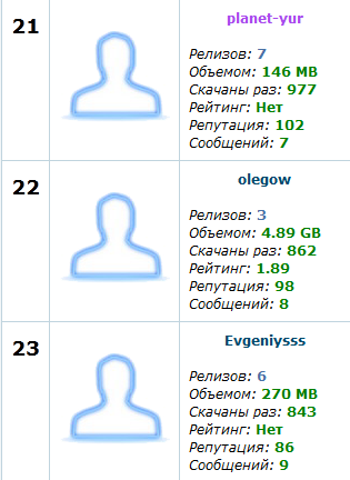 Создать десяток релизов не трудно,а вот заработать репутацию оказалось гораздо труднее,как оказалось большая часть скачавших *****,мягко говоря редиски,это можно увидеть на примере трёх товарищей ,писец,больше 800 рыл скачало,а до сотни так и не добрались,неужели так трудно ткнуть в "спасибо" и постоять на раздаче,хотя бы пару дней,после того как скачал