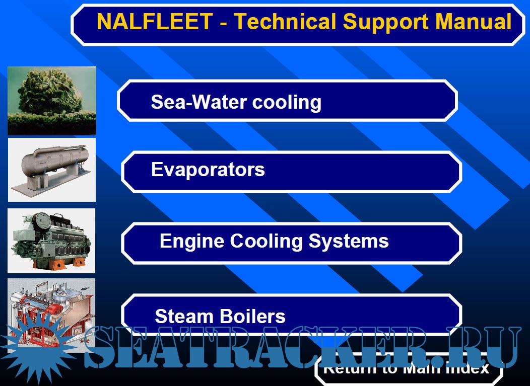 This manual has the objective to give the reader good basic understanding of the principles of operation and water treatment requirements of these applications. The attached dia gram shows a typical water circuit encountered on board ship. Incoming sea water is passed through an evaporator to produce high quality feedwater for engine cooling systems, boiler feedwater and drinking water. The NALFLEET product range is designed to prevent the damaging effects of scale and corrosion in each of the systems.